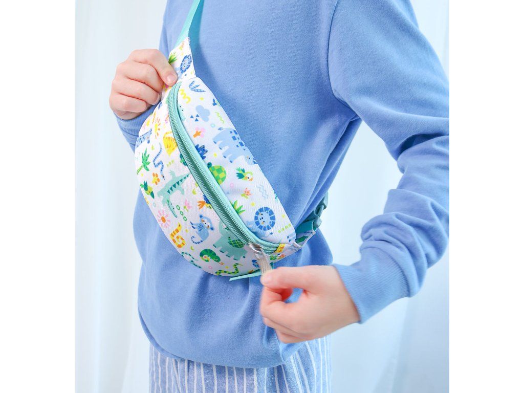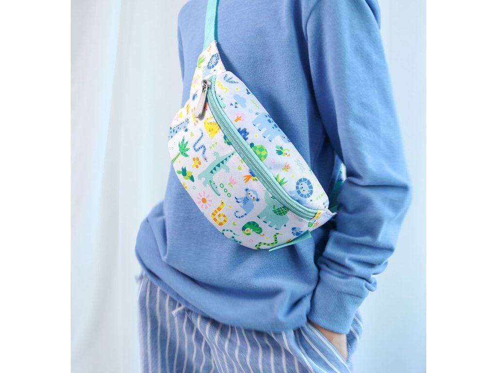 Dětská ledvinka s potiskem zvířat z džungle má nastavitelný popruh. Dá se nosit kolem pasu a lze jí použít i jako crossbody kabelku. Do přední přihrádky se snadno vejde peněženka a mobilní telefon. Zadní kapsa na zip je ideální na drobné cennosti. Doplňte si sadu batohem, lahví na pití a krabičkou na oběd ve stejném designu.