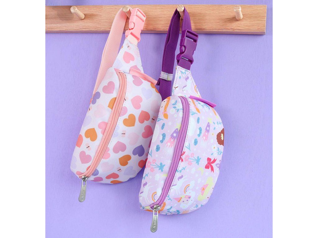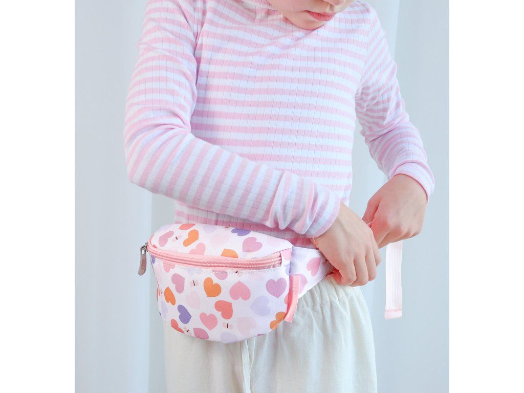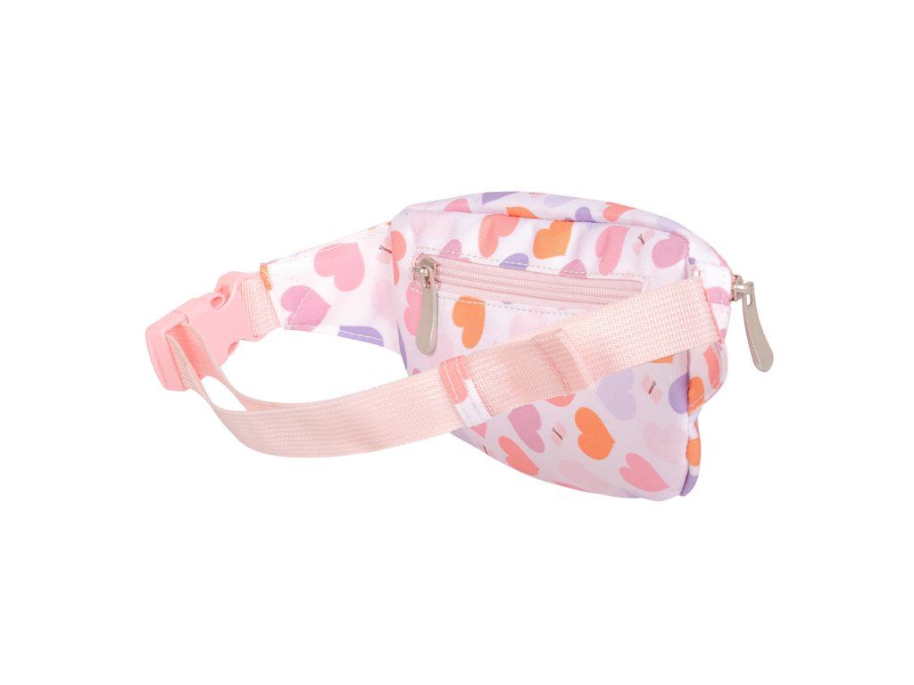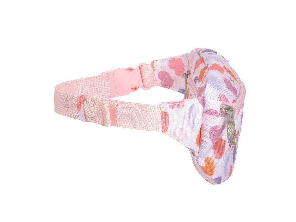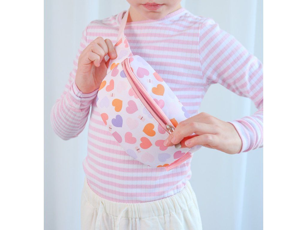 Dětská ledvinka s potiskem srdíček má nastavitelný popruh. Dá se nosit kolem pasu a lze jí použít i jako crossbody kabelku. Do přední přihrádky se snadno vejde peněženka a mobilní telefon. Zadní kapsa na zip je ideální na drobné cennosti. Doplňte si sadu batohem, lahví na pití a krabičkou na oběd ve stejném designu.