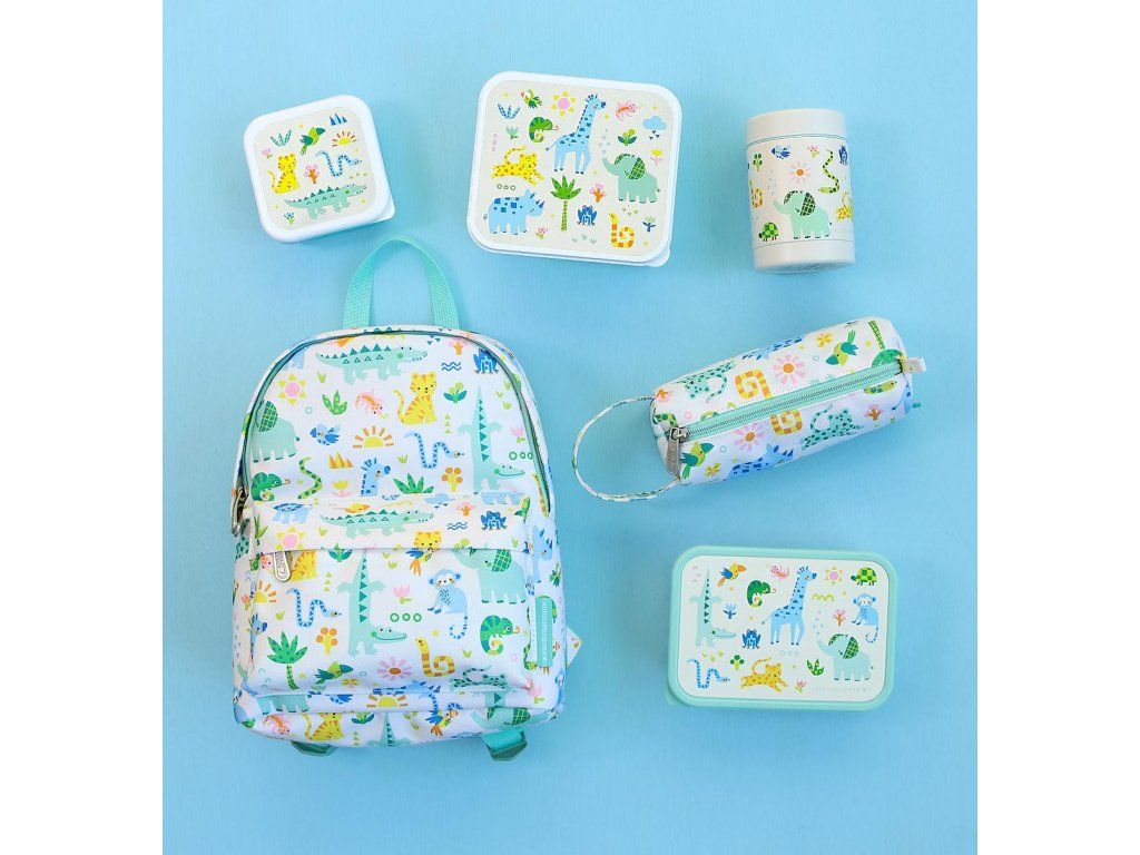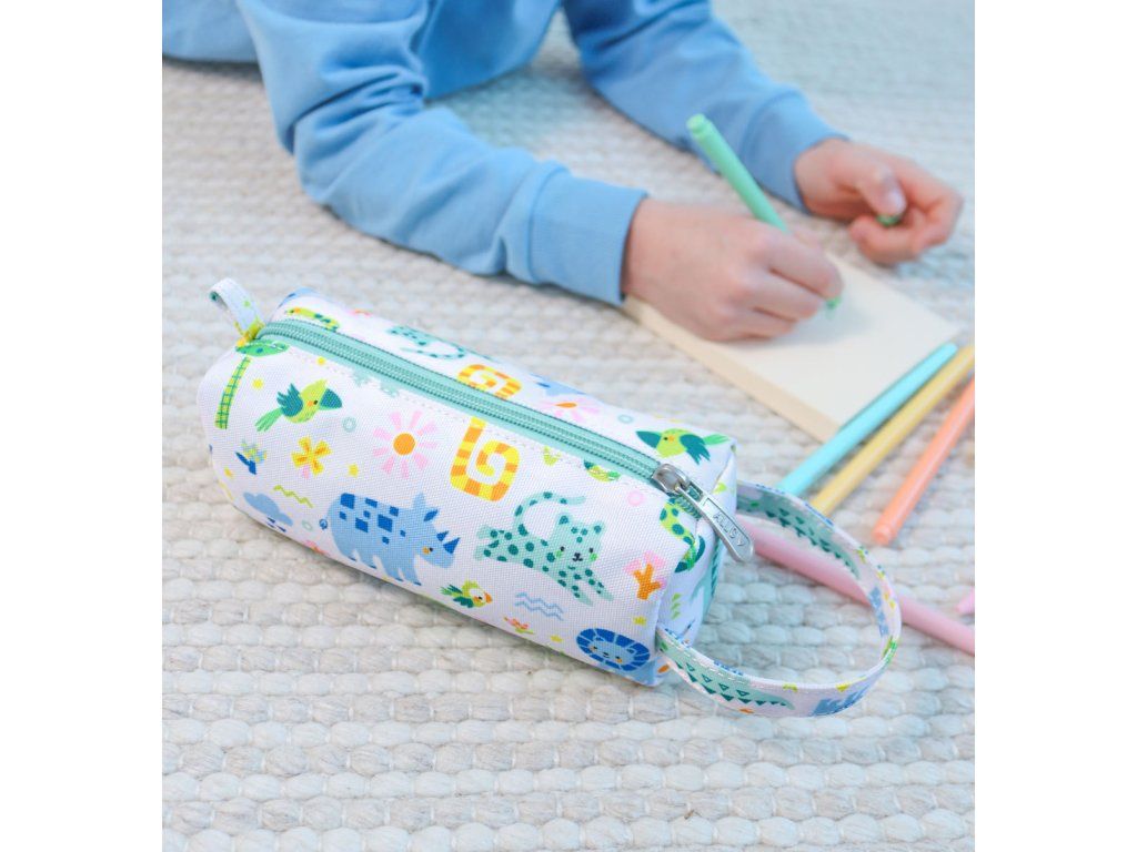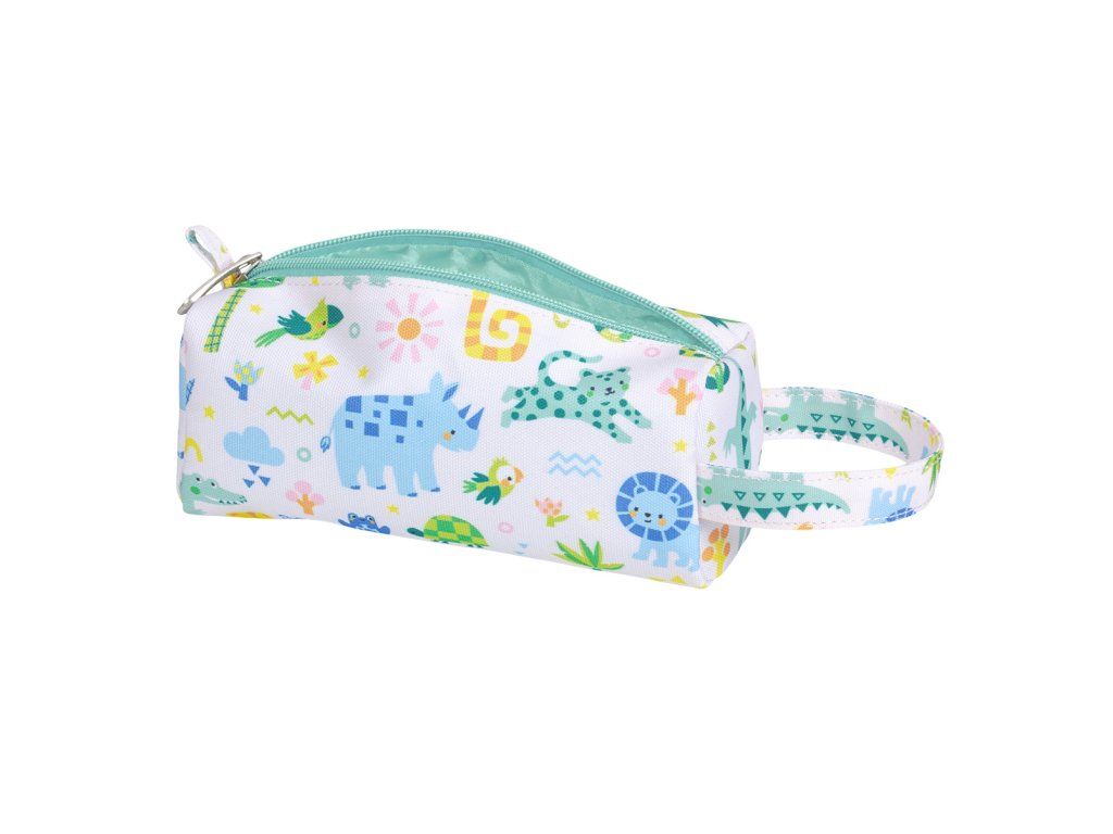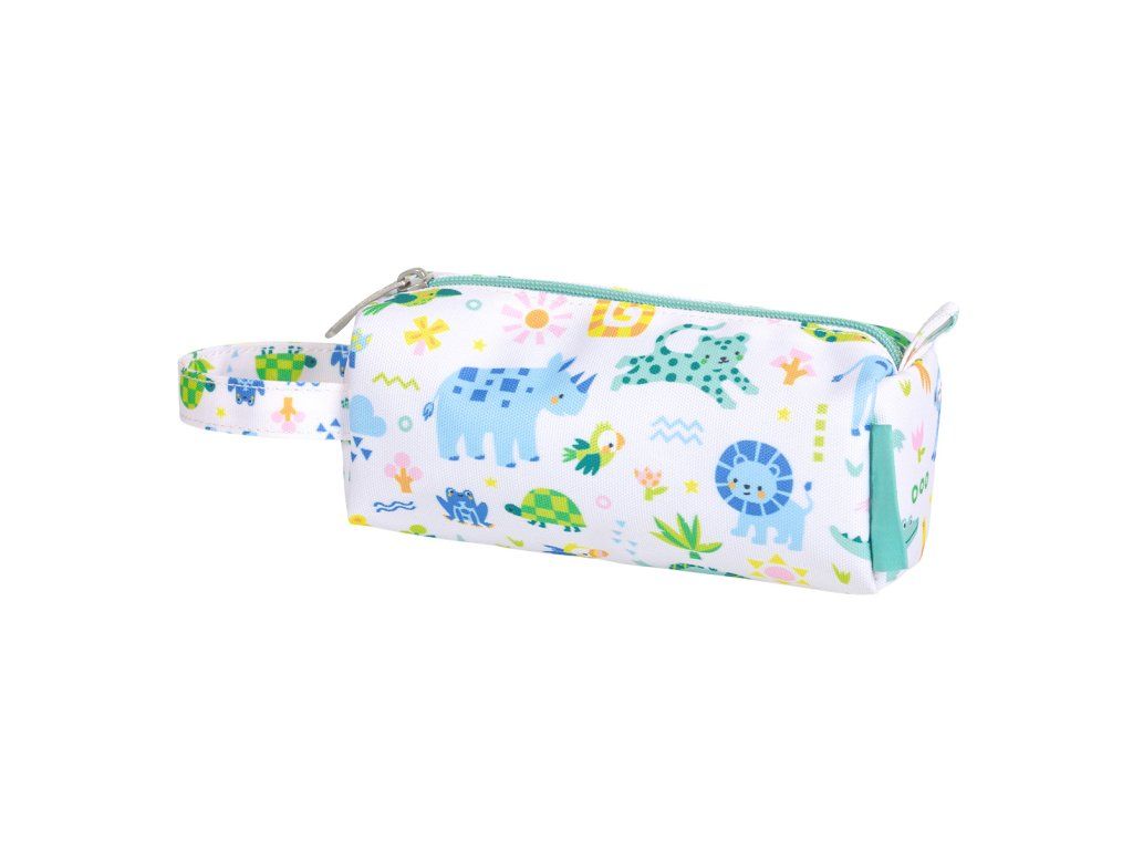 Pouzdro na pastelky, fixy nebo psací potřeby s potiskem zvířat z džungle je vyrobené z odolného polyesteru. Je ideální na cesty, do školy nebo na kroužky. Pouzdro se zapíná na zip, je podšité a má pohodlnou rukojeť. Tento praktický penál pomůže dětem udržet jejich pera, tužky i pastelky bezpečně na jednom místě.
