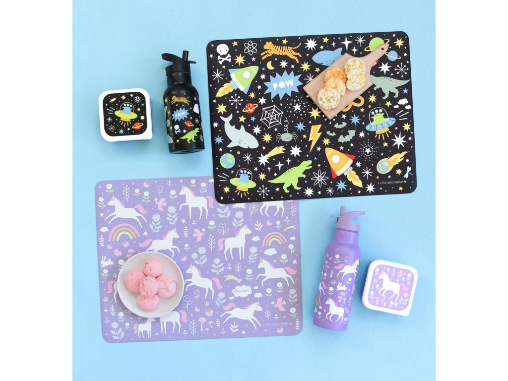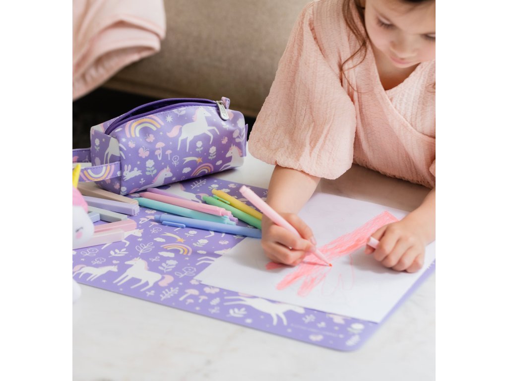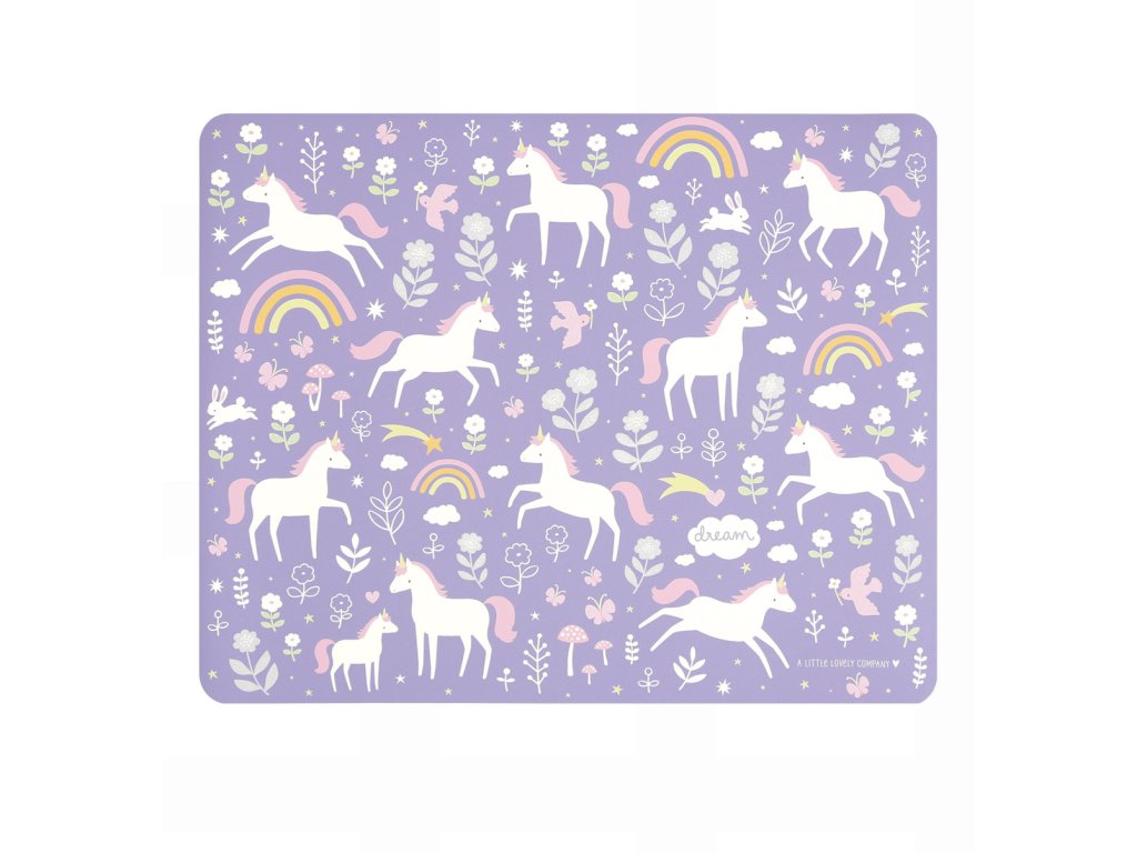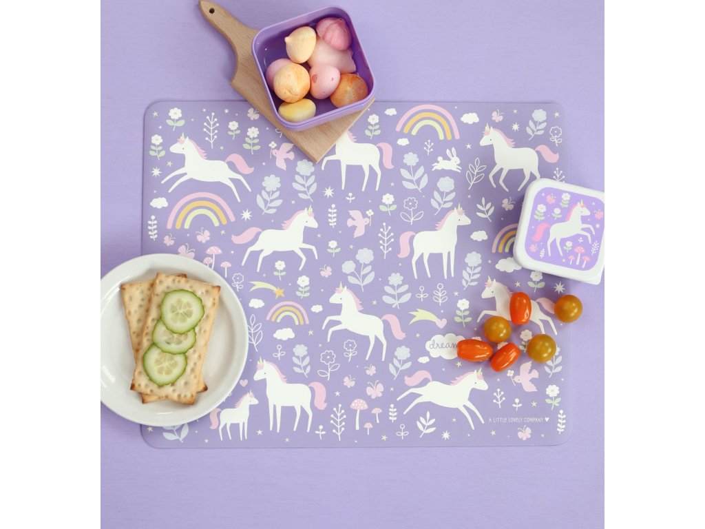 Světle fialové prostírání s jednorožci je ideální pro děti. Prostírání se snadno udržuje v čistotě a má velkorysý rozměr. To znamená, že nabízí dostatek prostoru pro pohodlné stolování nebo tvoření. Díky protiskluzové vrstvě prostírání dobře drží na svém místě.