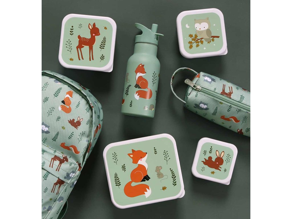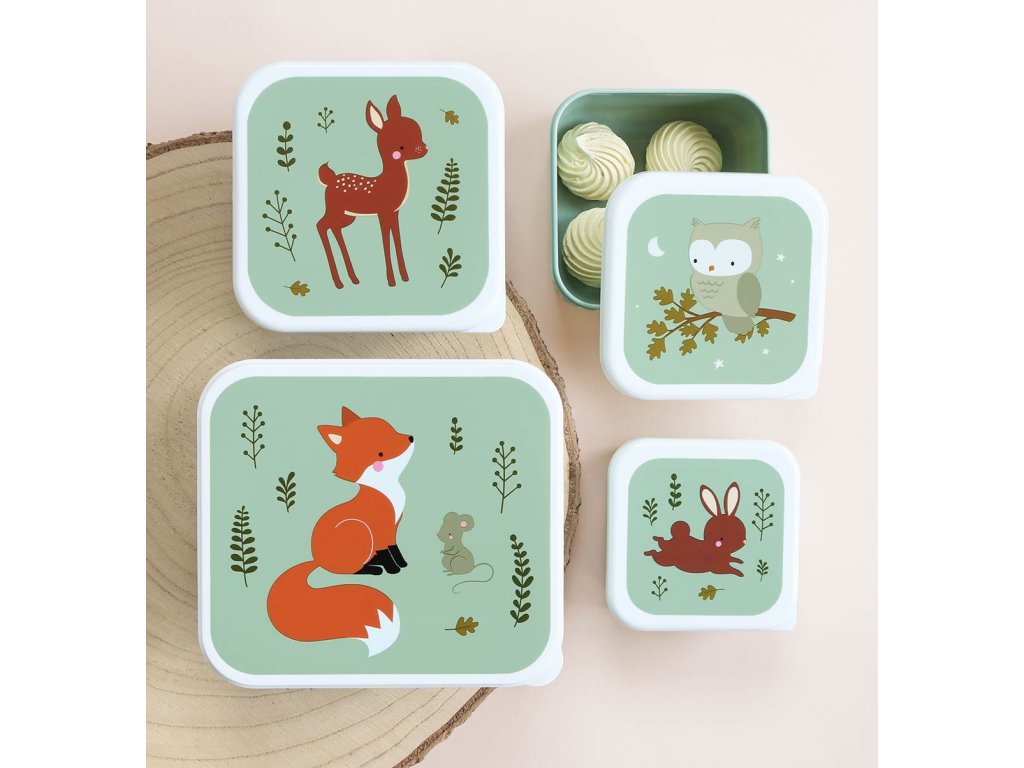 Sada čtyř krabiček na oběd a svačinu ve čtyřech různých velikostech. Krabičky mají stejný design s lesními zvířátky. Krabičky se snadno otevírají a zavírají a lze je stohovat do sebe pro pohodlné skladování.