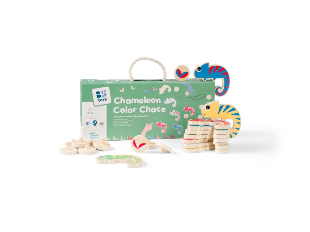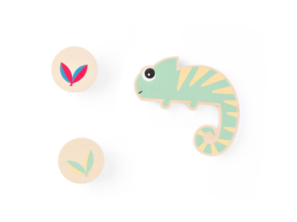Skvělá zábava pro 2-10 hráčů od 4 let. Dokážete přechytračit chameleona, který se snaží splynout s okolím? Děti zvedají kulaté dřevěné žetony a hledají list, pod který se chameleon nemůže schovat. Musí mít dvě barvy, které nejsou na chameleonovi. Hra má tři úrovně obtížnosti a díky tomu se dětem hned tak neomrzí.