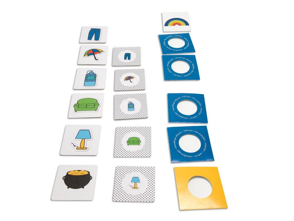 Obsah hry: 51 pruhovaných karet, 50 puntíkovaných karet a 22 obálek (20 modrých, 1 duhová, 1 zlatá).