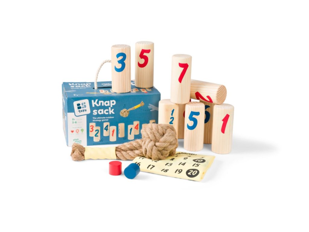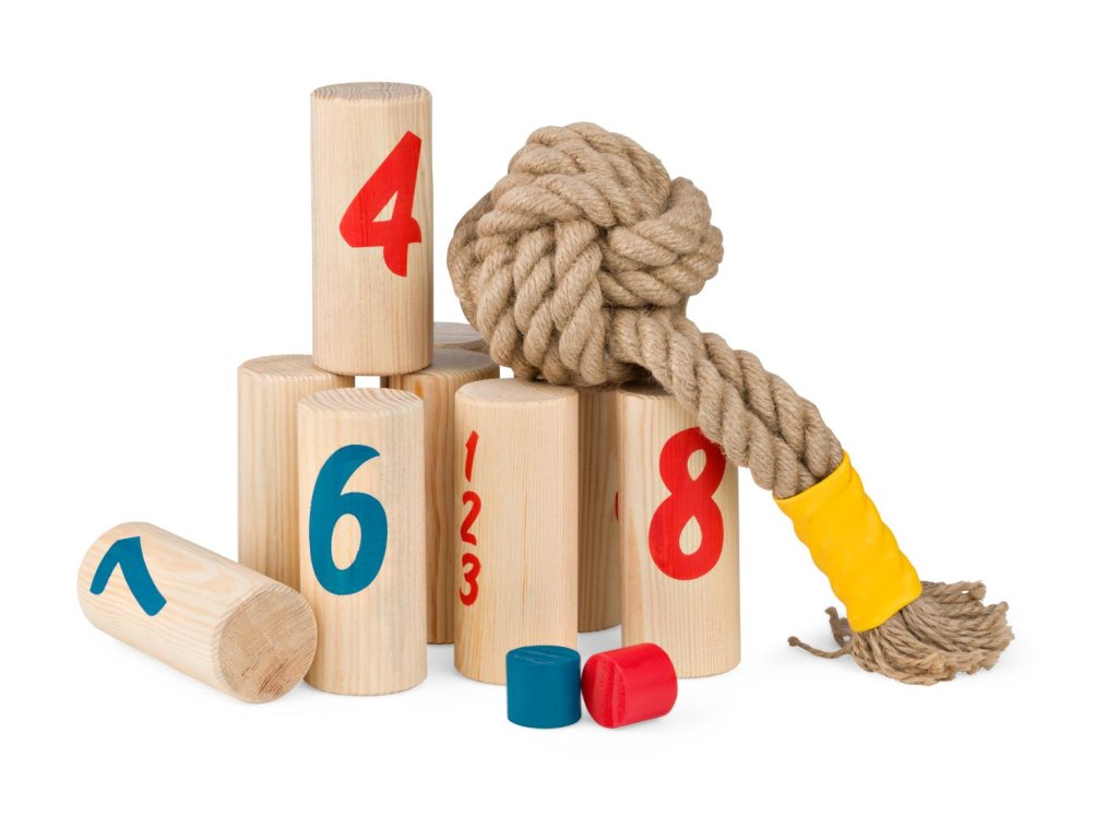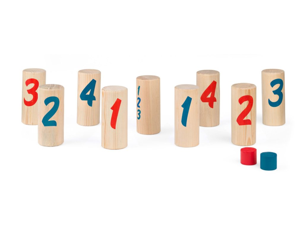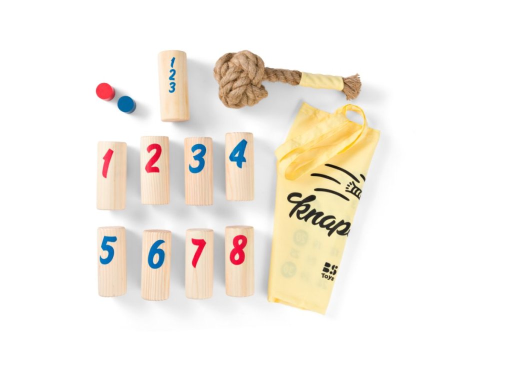 Skvělá zábava pro 2-6 hráčů od 8 let. Dokonalá strategická hra na zahradu nebo do parku. Hrajte jeden na jednoho nebo utvořte týmy. Cílem hry je pomocí házecího uzlu shodit dřevěné kolíky, které mají na sobě čísla. Děti se snaží shodit kolíky tak, aby získaly co nejvíce bodů. Vítězem je ten, kdo jako první získá přesně 30 bodů nebo shodí všechny kolíky ve své barvě. Rychlá a aktivní hra plná překvapení: kdo bude hrát nejchytřeji?