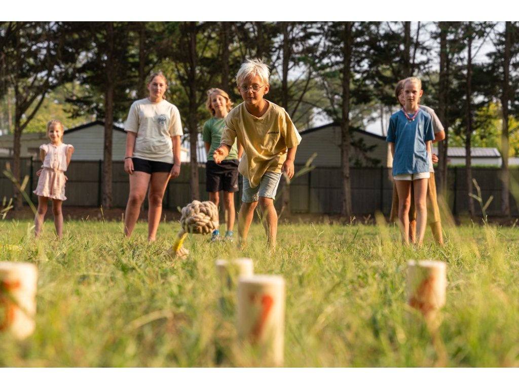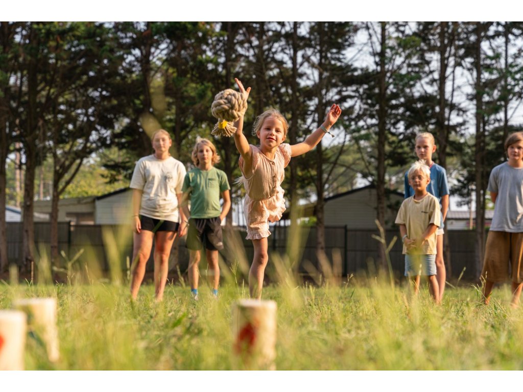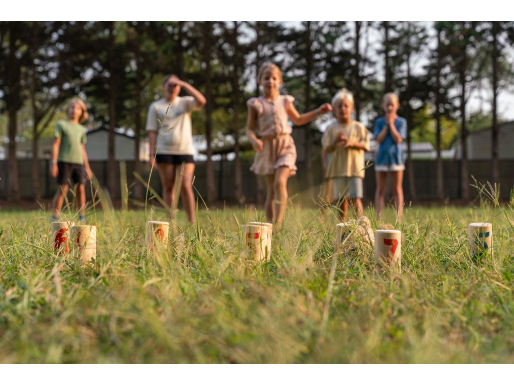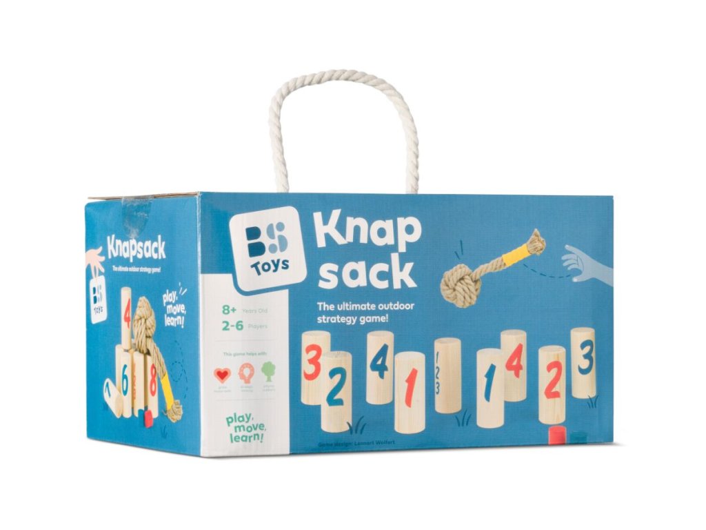 Skvělá zábava pro 2-6 hráčů od 8 let. Dokonalá strategická hra na zahradu nebo do parku. Hrajte jeden na jednoho nebo utvořte týmy. Cílem hry je pomocí házecího uzlu shodit dřevěné kolíky, které mají na sobě čísla. Děti se snaží shodit kolíky tak, aby získaly co nejvíce bodů. Vítězem je ten, kdo jako první získá přesně 30 bodů nebo shodí všechny kolíky ve své barvě. Rychlá a aktivní hra plná překvapení: kdo bude hrát nejchytřeji?