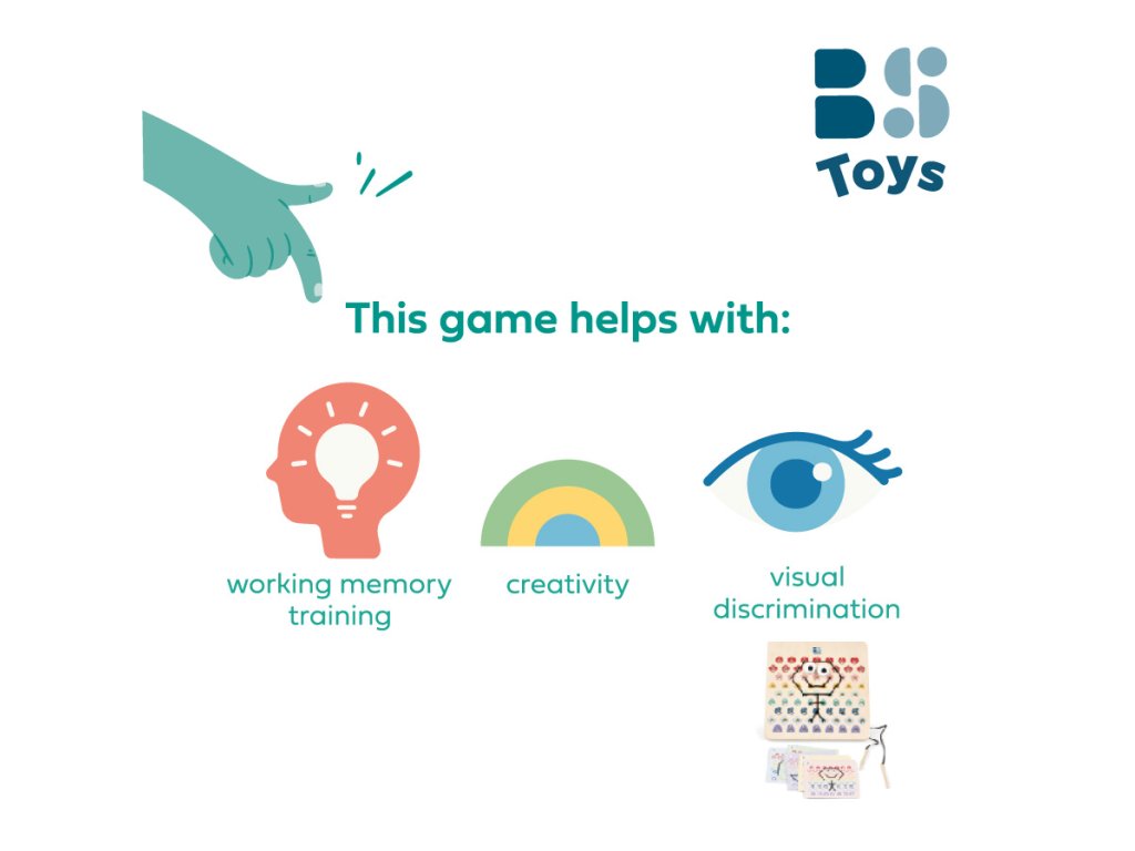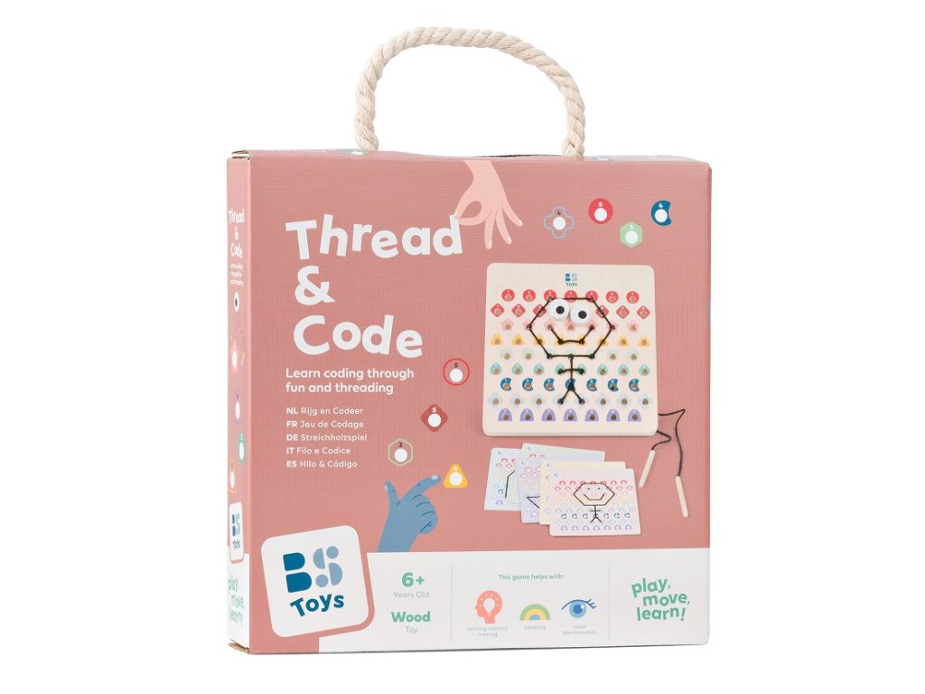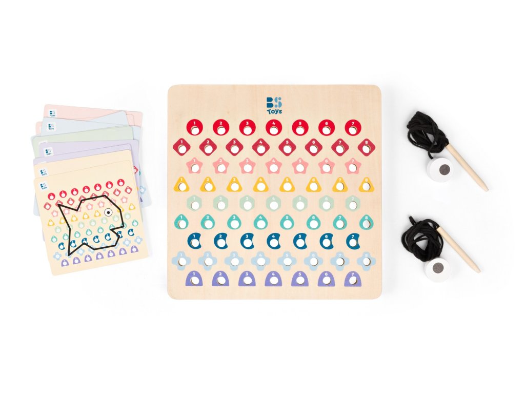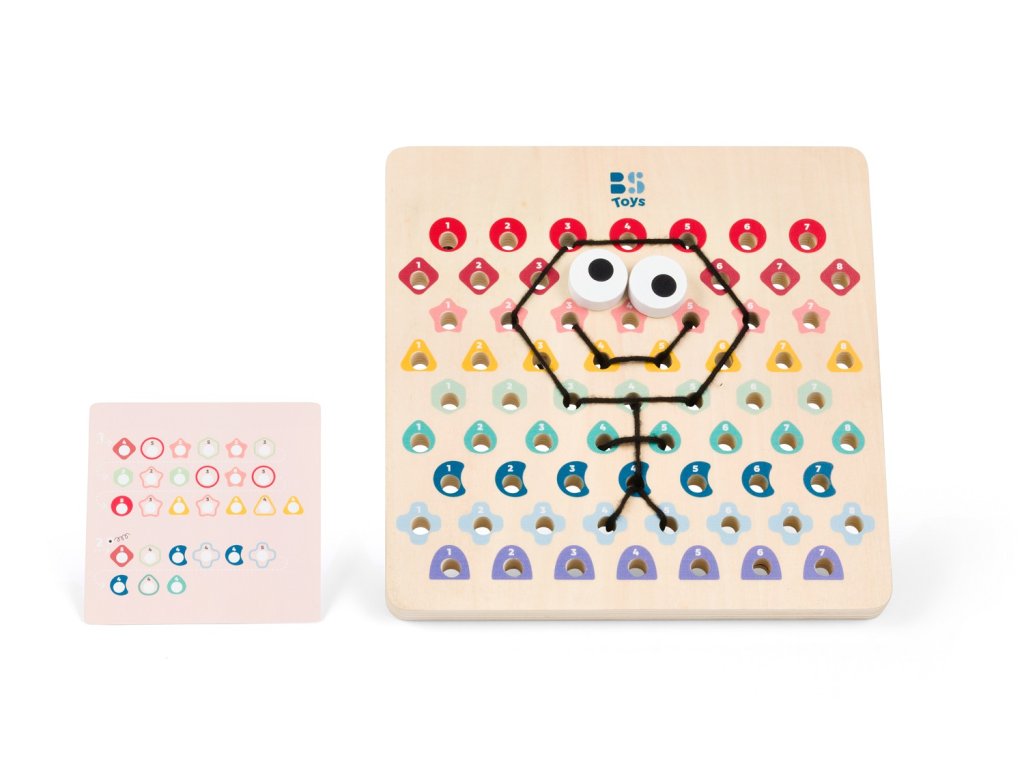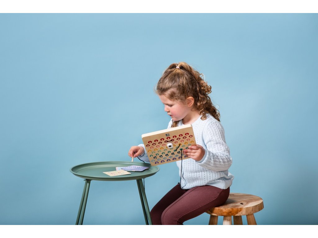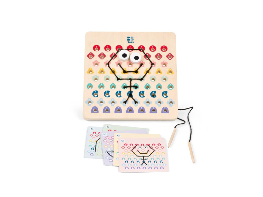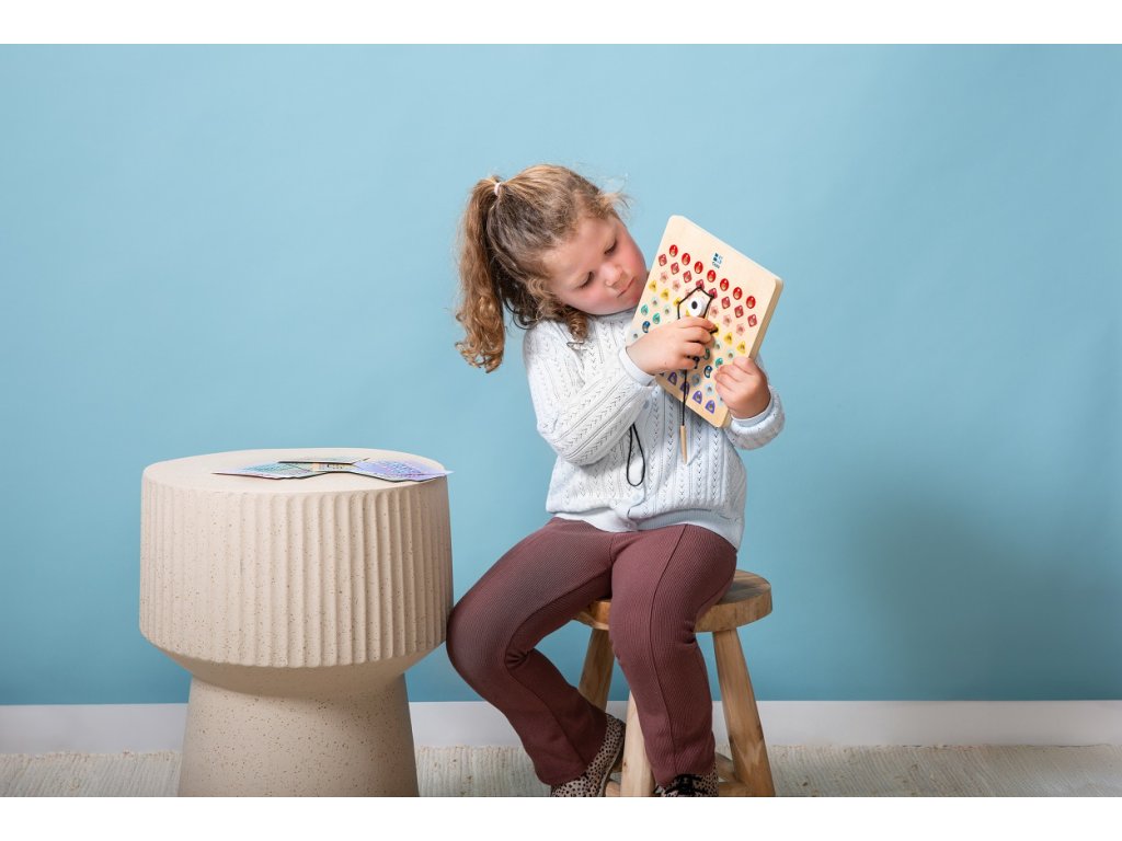 V této hře obdrží děti dřevěnou perforovanou desku, 2 šňůrky a kartičky s předlohami. Podle barevných kódů na kartičkách proplétají děti šňůrky tak, aby vznikly krásné motivy. Začněte jednoduššími kartičkami a postupujte k těm obtížnějším. Jakmile dokončíte kód, otočte kartu a zkontrolujte, zda výtvor na desce odpovídá vzoru. Určeno pro děti od 6 let.