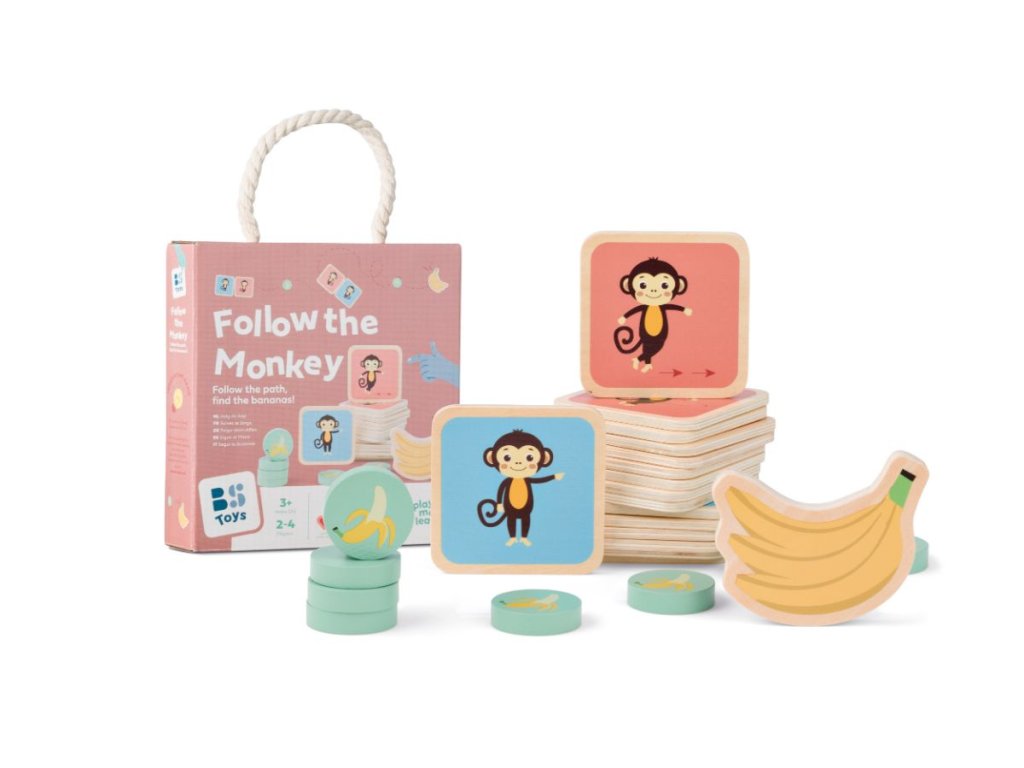 Hra obsahuje: 16 dřevěných žetonů s opičkami (8 x 8 x 0,6 cm), 8 žetonů (4 x 1 cm), 1 banánová trofej (9,5 x 7 x 1,2 cm).