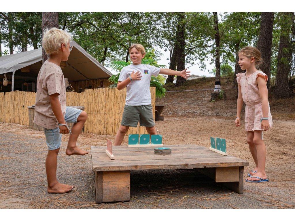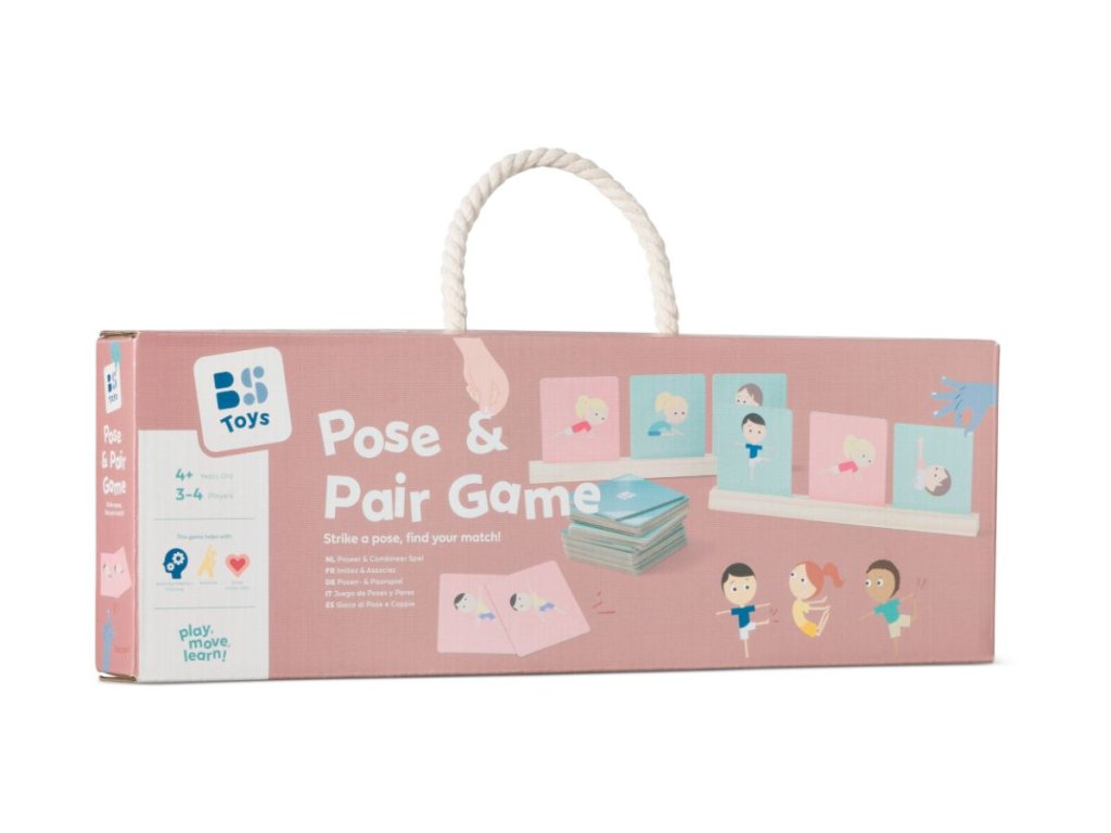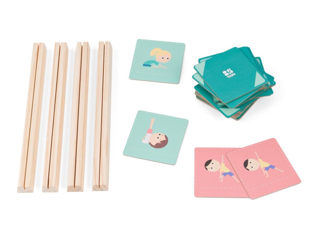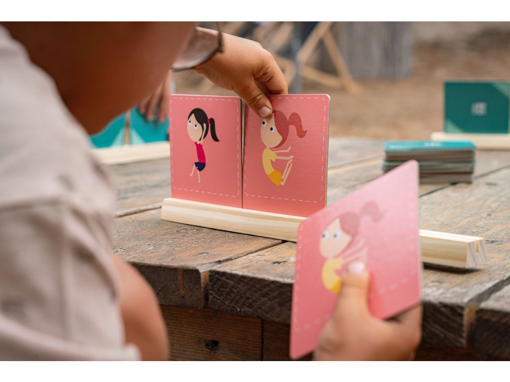 Hra, která kombinuje pohyb a postřeh pro 3-4 hráče od 4 let. Každý hráč dostane 3 karty, na kterých jsou vyobrazené jógové pozice. Karty si děti postaví na dřevěnou základnu tak, aby je nikdo neviděl. Zbylé karty dejte na hromádku. Počítejte „1–2–3!“ a na 3 si každý hráč vybere jednu kartu v libovolném pořadí a předvede pozici z obrázku. Přitom sledujte ostatní hráče. Pokud někdo předvádí stejnou pozici, zakřičte „pár“ a získá tak obě karty. Ty pak nahradíte novými z hromádky. Hraje se, dokud nejsou všechny karty spárované. Vyhrává hráč, který má nejvíce karet. Hráči musí pozorně sledovat ostatní a rychle reagovat, aby získali správnou kartu. Tato hra trénuje pohyb, paměť a zlepšuje schopnost soustředění.