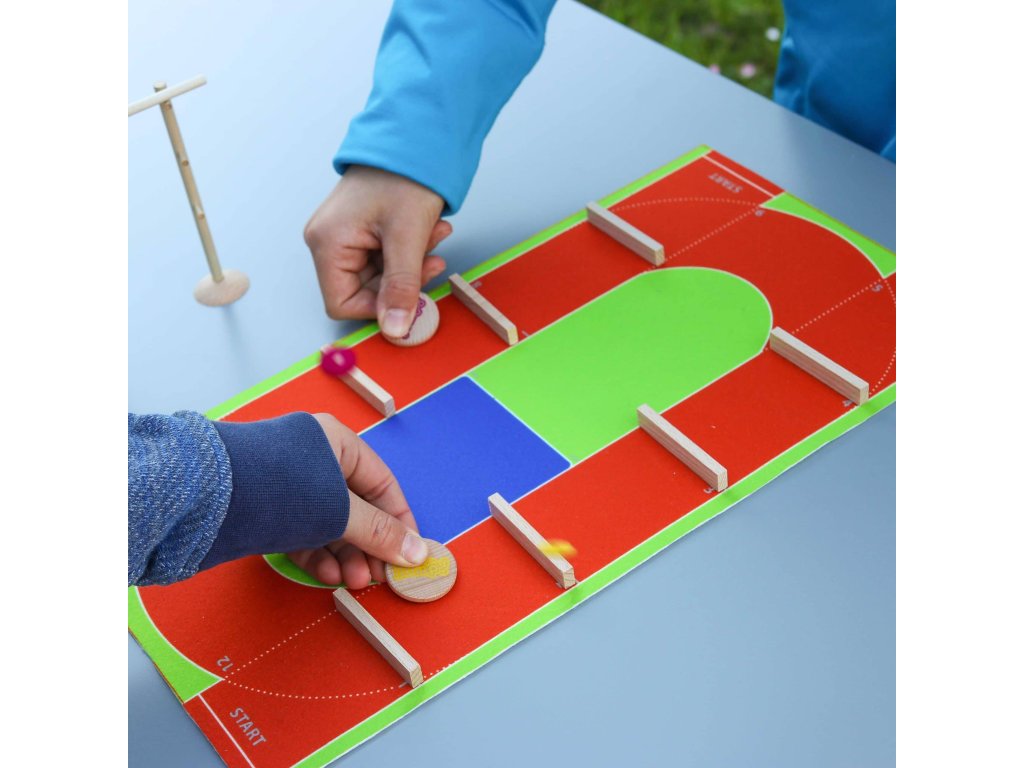 Obsah hry: 1 plstěná atletická dráha, 2 JUMP disky, 6 malých disků, 8 dřevěných přepážek, 1 dřevěná sada na skok vysoký.