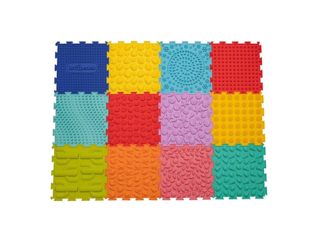 Obsah sady: 12 barevných senzorických podložek o rozměrech 24,5 x 24,5 cm