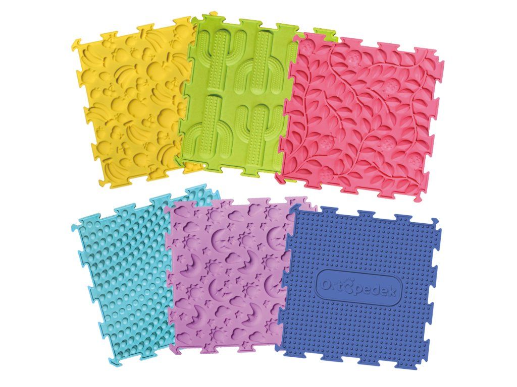 Obsah sady: 6 barevných senzorických podložek o rozměrech 24,5 x 24,5 cm.