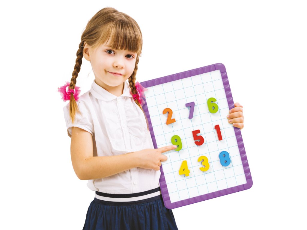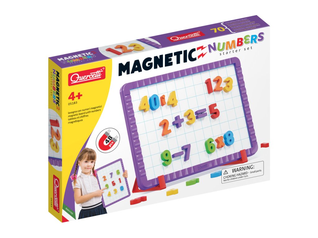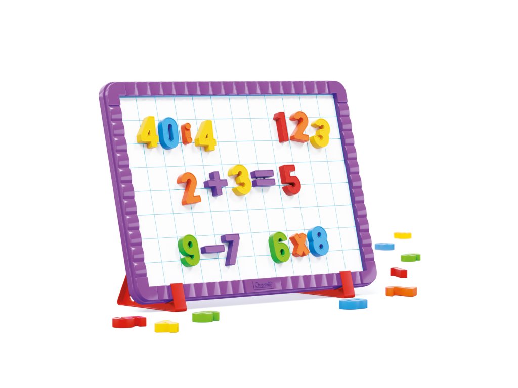 Obsah balení: 48 barevných magnetických čísel a symbolů, 1 magnetická tabule, 2 stojánky.