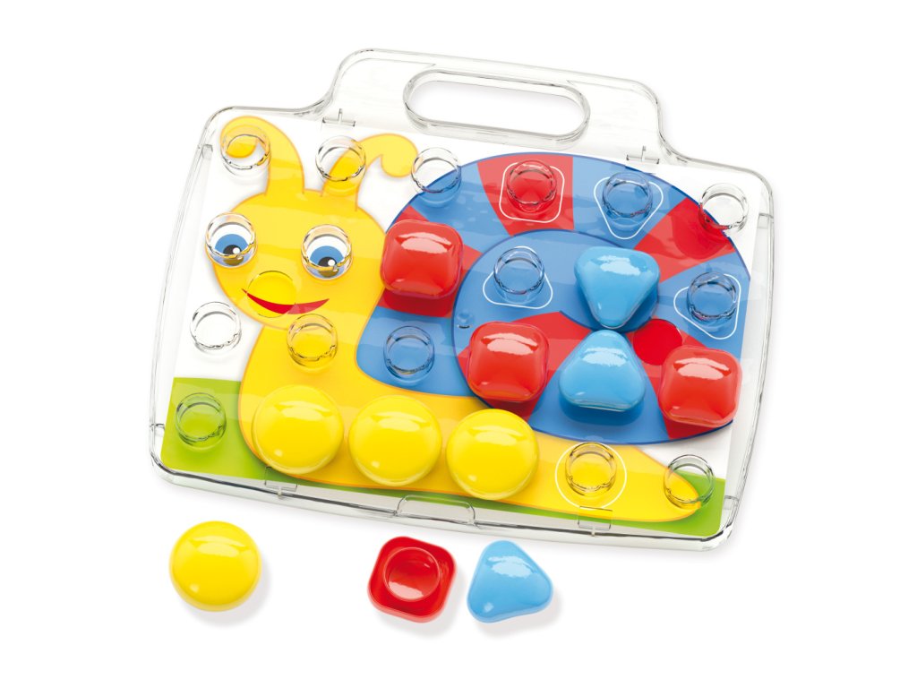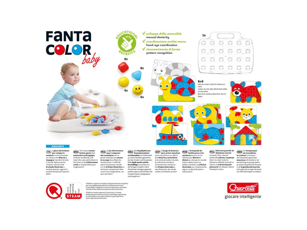FantaColor Baby je kreativní hra s mozaikou určená dětem od 18 měsíců. Obsahuje 24 velkých barevných kolíčků, které jsou snadno uchopitelné pro malé dětské ruce. Kolíčky děti vkládají do pevné průhledné perforované desky. Hra pomáhá rozvíjet jemnou motoriku, koordinaci oko–ruka, rozlišování barev i první logické schopnosti. Součástí balení je 8 oboustranných karet s obrázky, které slouží jako podklady pro skládání.