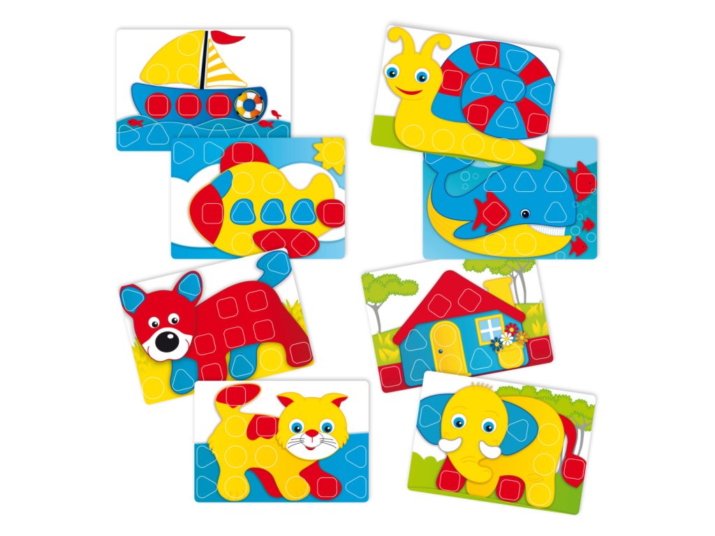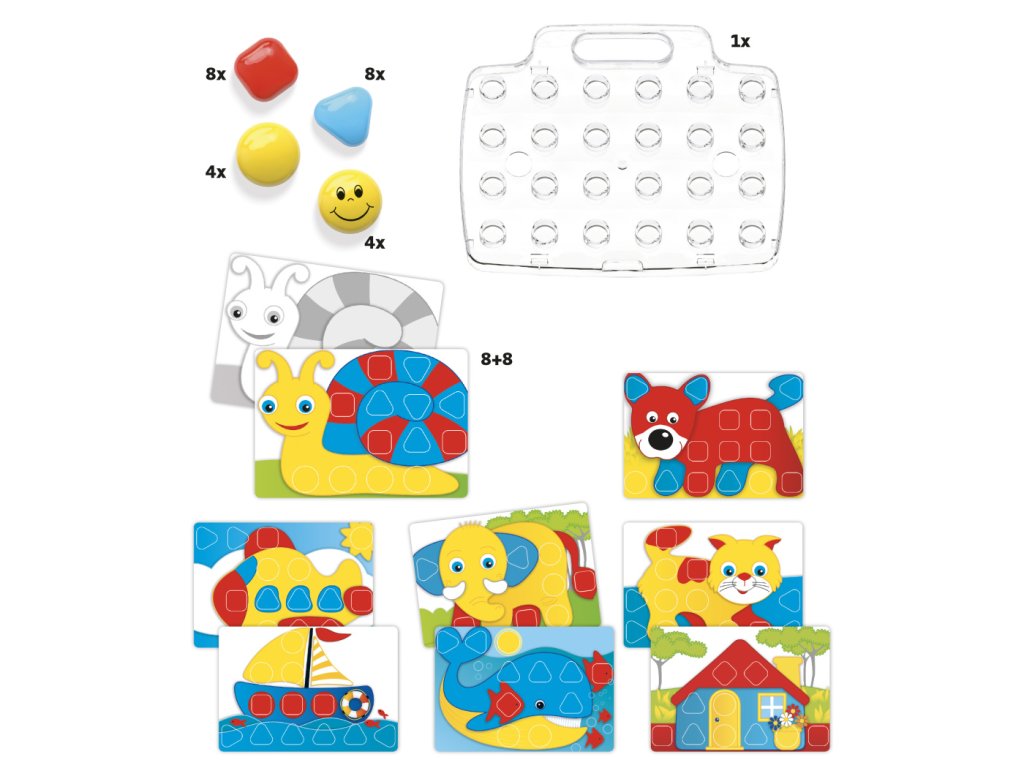 Obsah balení, 1 průhledná tabule, 24 velkých kolíčků (průměr 46 mm) ve 3 tvarech a 3 barvách 8 karet s obrázky.