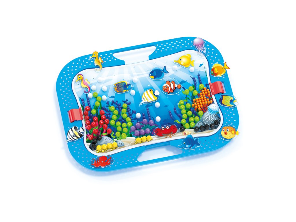 Kreativní mozaiková hra určená dětem od 3 let. Perforovaná plastová deska je vsazena v rámu s oblými hranami. Děti vkládají plastové barevné kolíčky do otvorů v desce a vytvářejí obrázky s rybami a dalšími mořskými živočichy podle šablony z přiloženého alba, nebo si mozaiku tvoří podle vlastní fantazie. Díky zabudovaným rukojetím je hra ideální i na přenášení. Po skončení hry lze vše uložit do kufříku, jehož víko po zajištění pojistkou tvoří sama hrací deska.