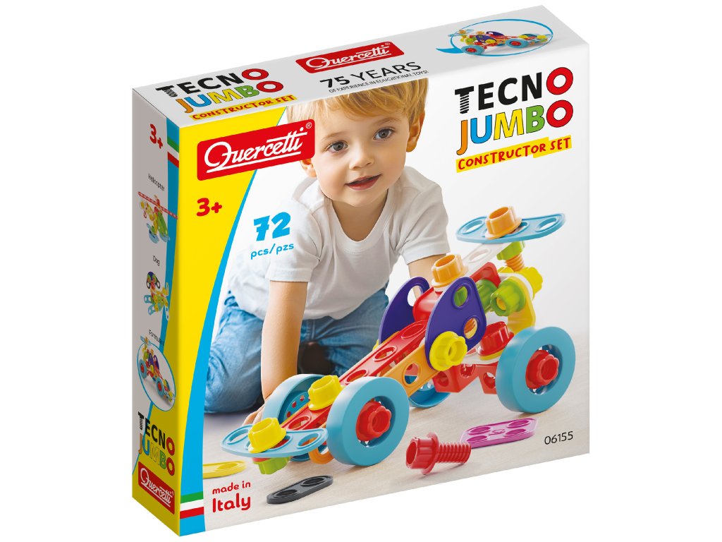 Šrouby, matice, křídlové matice, kola a perforované dílce z odolného, netříštivého plastu je možné sestavovat bez použití jakéhokoli nářadí. Děti od 3 let budou potřebovat jen své ruce a představivost. Tato sada totiž obsahuje všechno, co je nezbytné k sestrojení aut, helikoptér, jeřábů nebo dalších strojů, které dětem přijdou na mysl. Stavebnice Tecno Jumbo rozvíjí koordinaci, logické myšlení i tvořivost a zábavnou formou pomáhá dětem pochopit základní principy mechaniky.