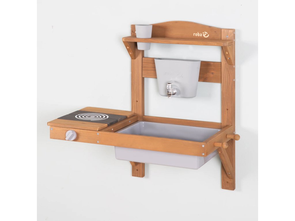 Menší dřevěná kuchyňka k zavěšení je skvělou volbou pro malé kuchaře od 18 měsíců. Je ideální na zahradu, terasu i balkon a umožňuje dětem hrát si pohodlně i v menším prostoru. Součástí balení je kuchyňské příslušenství (hrnec, poklice a obracečka), které hru ještě více přiblíží skutečnému vaření. Kuchyňka je vyrobena z kvalitního masivního dřeva, které pochází z udržitelných zdrojů. Nabízí dětem mnoho možností, jak rozvíjet fantazii. Nechybí varná deska s otočným knoflíkem, praktické umyvadlo, nádoba na vodu s kohoutkem ani háčky na zavěšení náčiní. Děti si tak mohou hrát s vodou, pískem i dalšími doplňky a vytvářet vlastní kuchařská dobrodružství. Kuchyňku lze snadno a bezpečně připevnit na zeď, čímž šetří místo a zároveň zajistí stabilitu při hraní. Díky odolné povrchové úpravě je vhodná pro venkovní použití po celý rok a snadno se udržuje. Hraní s kuchyňkou přirozeně podporuje rozvoj dětské fantazie, sociálních dovedností i jemné motoriky při manipulaci s jednotlivými prvky.