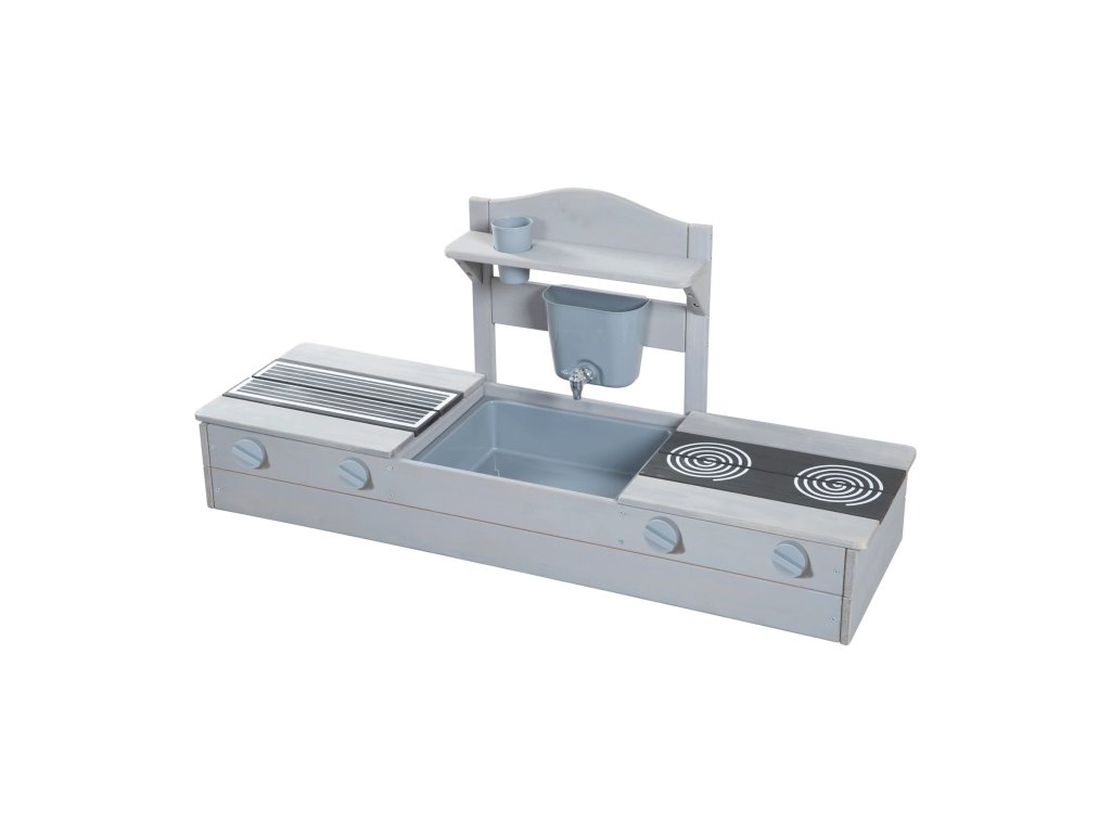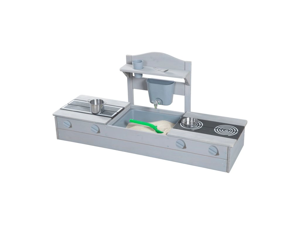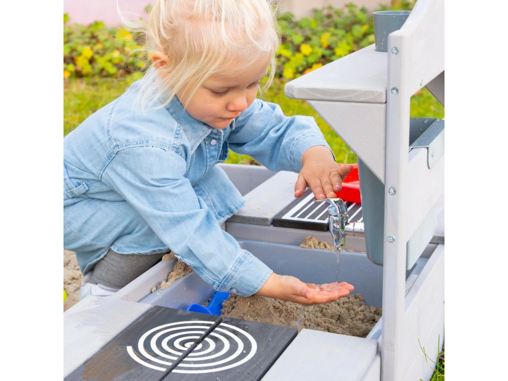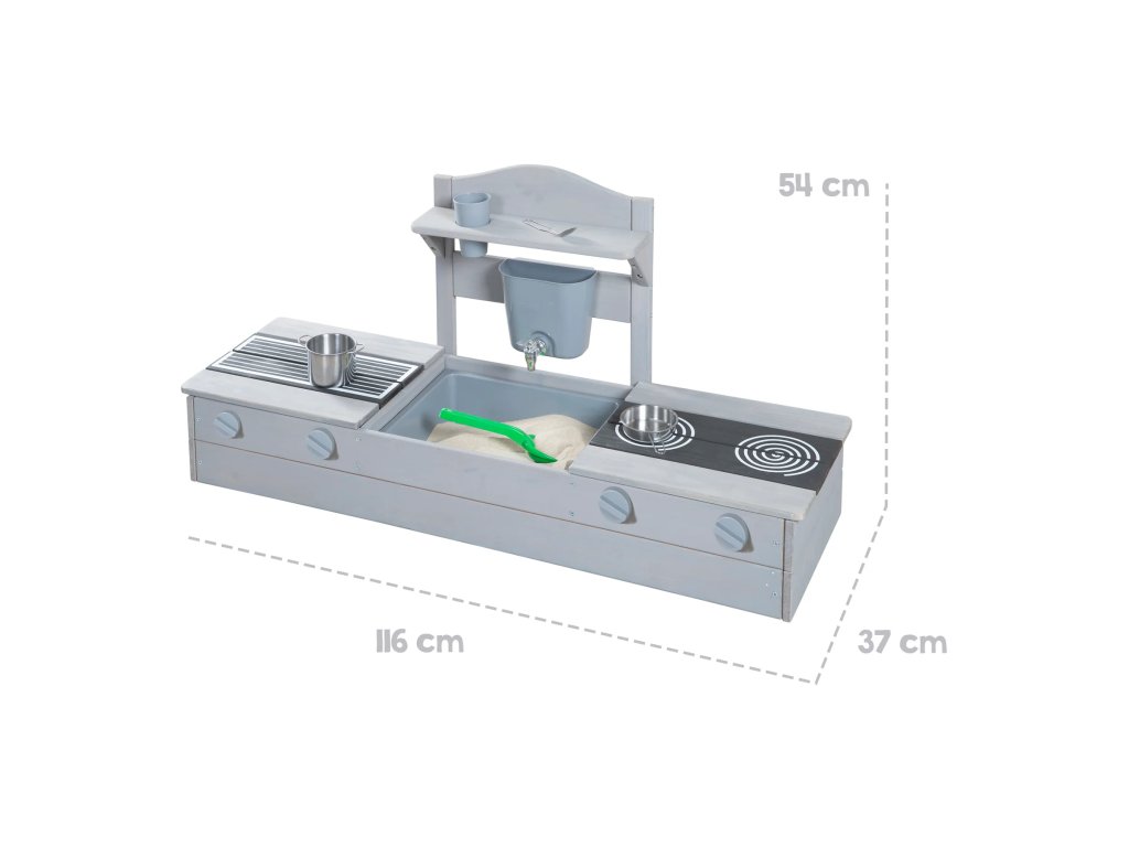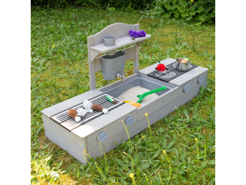 Praktické a prostorově úsporné pískoviště 2v1 s integrovanou kuchyňkou pro děti od 12 měsíců. Ideální řešení pro malé venkovní prostory, jako jsou balkony, terasy nebo zahrady. Sada obsahuje dvě odnímatelná sedátka s motivem grilu a varné desky, plastovou hrací vaničku, nádobu na vodu s kohoutkem, hrnek a dva úložné prostory pro hračky či doplňky. Děti si tak mohou hrát s pískem i vodou a nebo rozvíjet svou fantazii při vaření. Díky rozměrům se pískoviště perfektně hodí i na menší balkony, přitom stále poskytuje dostatek prostoru pro kreativní hru. Vyrobeno z masivního dřeva pocházejícího z udržitelných zdrojů. Pískoviště je vhodné pro dlouhodobé venkovní použití. Splňuje bezpečnostní normy, takže hraní je bezpečné.