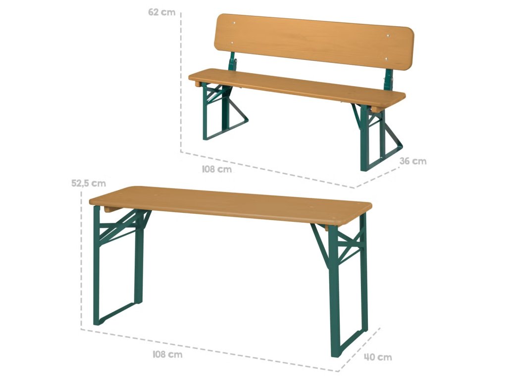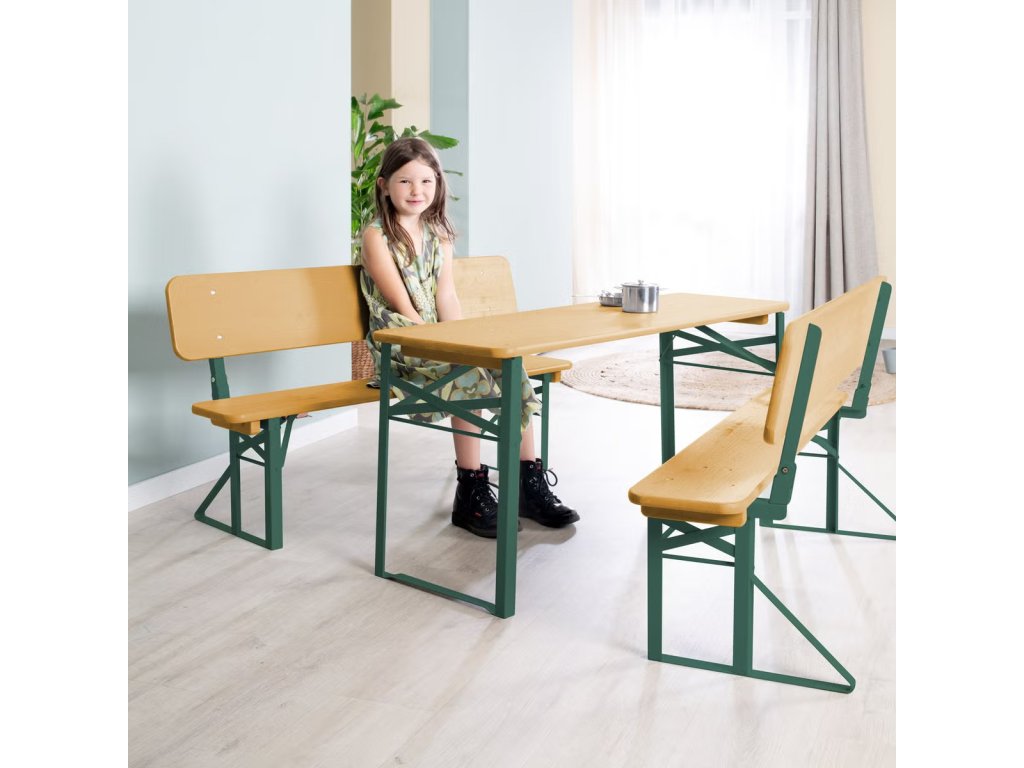 Skládací dětská sedací sada je ideálním nábytkem pro venkovní oslavy, pikniky nebo zahradní párty. Sada obsahuje jeden dětský stůl a dvě lavice s opěradly, které poskytují pohodlné místo až pro čtyři děti (do 80 kg) pro hraní a tvoření venku. Tento praktický set je vhodný pro děti od 24 měsíců a díky skládacímu mechanismu nezabere mnoho místa, což usnadňuje jeho uskladnění. Dětská sedací souprava je navržena s důrazem na bezpečnost, všechny hrany jsou zaoblené, aby chránily malé děti při hře. Díky pevnému masivnímu dřevu, které pochází z udržitelných zdrojů a lakovaným kovovým nohám s mechanismem pro skládání je nábytek stabilní a odolný. Rychlá montáž je zajištěna promyšleným designem, který nevyžaduje složité nástroje. Tento set je ideální pro venkovní aktivity a lze jej kombinovat s dalšími produkty značky roba, jako jsou venkovní kuchyňky nebo lehátka na zahradu.