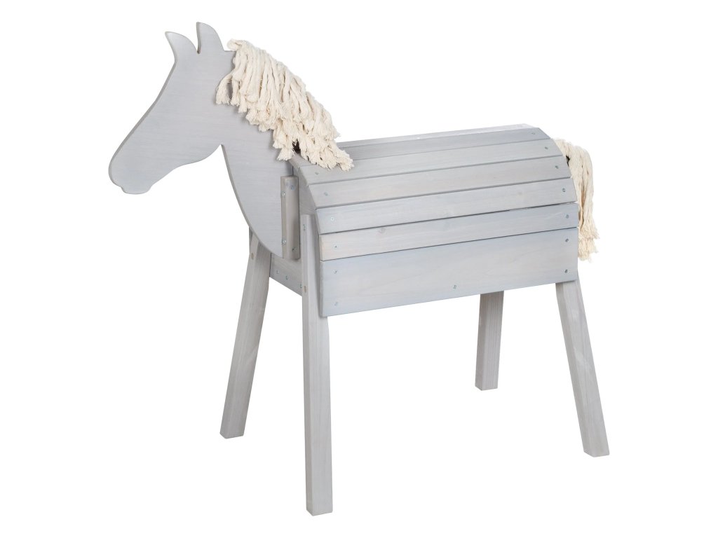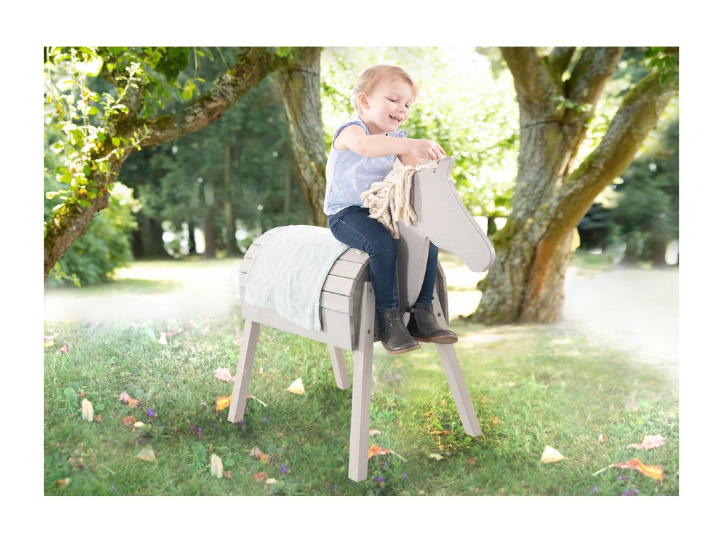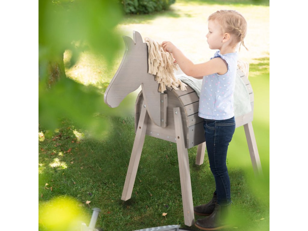 Venkovní dřevěný kůň pro děti od 3 let nabízí nekonečné možnosti zábavy a rozvoje. Tento robustní a pevný kůň je perfektní pro hru na zahradě. Děti si mohou užívat lezení, jízdu na koni, akrobatické cvičení nebo gymnastiku. Kůň podporuje kreativitu a rozvoj jezdeckých technik. Hříva a ocas koně se dají stylově upravovat nebo zaplétat, což dětem poskytuje skutečný zážitek z jízdy na koni. Výška koně v kohoutku je 70 cm. Díky výztuze v těle je zajištěna vysoká stabilita, což je ideální pro aktivní hry. Koně mohou děti používat pouze pod dohledem dospělé osoby. Doporučujeme ho přes noc přikrýt, tak, aby byl chráněn před zvířaty (kočky, ptáci), která by mohla přilákat jeho hříva a ocas. Kůň je vyrobený z masivního dřeva z udržitelných zdrojů. Doporučujeme, aby zahradního koně sestavovaly dvě dospělé osoby.