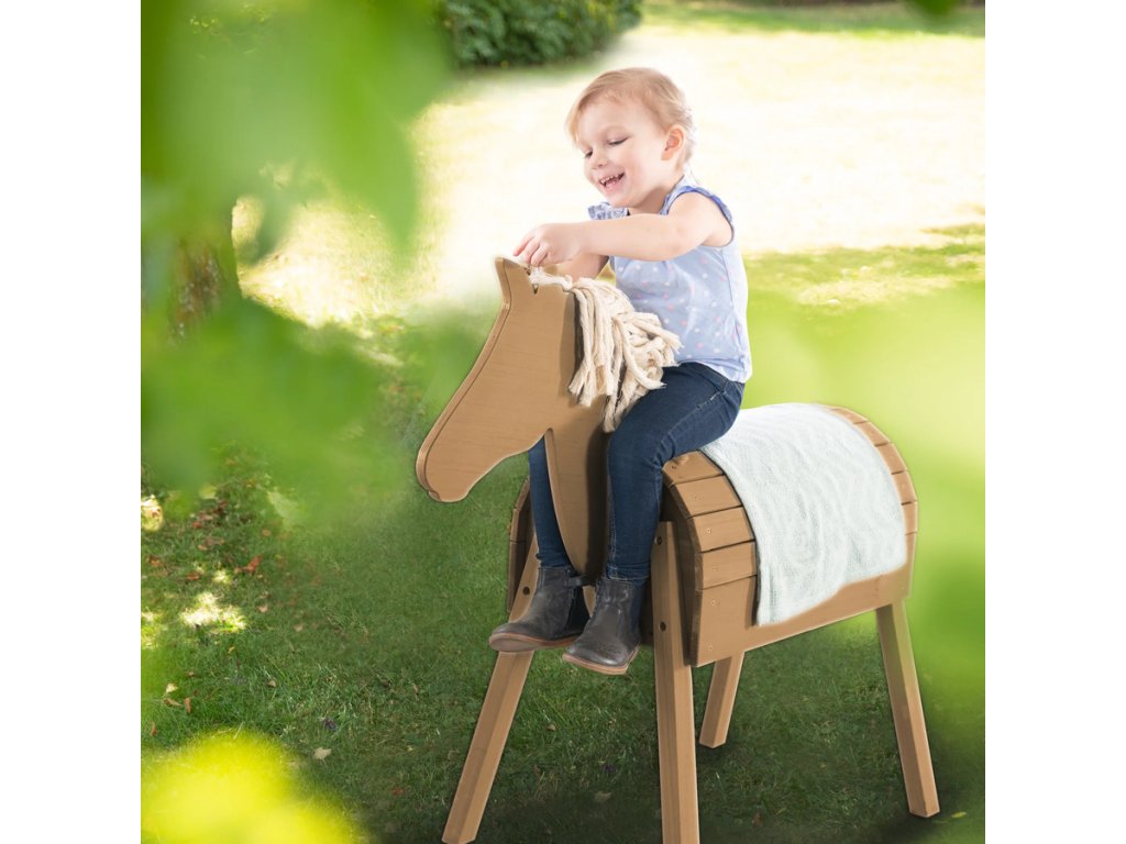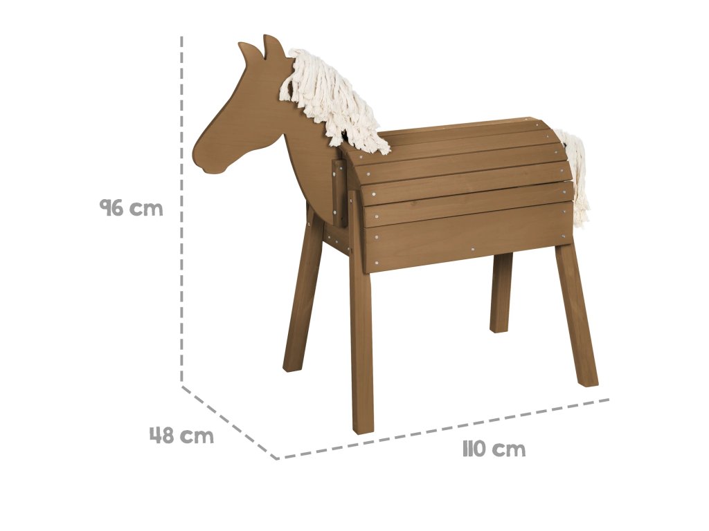 Venkovní dřevěný kůň pro děti od 3 let nabízí nekonečné možnosti zábavy a rozvoje. Tento robustní a pevný kůň je perfektní pro hru na zahradě. Děti si mohou užívat lezení, jízdu na koni, akrobatické cvičení nebo gymnastiku. Kůň podporuje kreativitu a rozvoj jezdeckých technik. Hříva a ocas koně se dají stylově upravovat nebo zaplétat, což dětem poskytuje skutečný zážitek z jízdy na koni. Výška koně v kohoutku je 70 cm. Díky výztuze v těle je zajištěna vysoká stabilita, což je ideální pro aktivní hry. Koně mohou děti používat pouze pod dohledem dospělé osoby. Doporučujeme ho přes noc přikrýt, tak, aby byl chráněn před zvířaty (kočky, ptáci), která by mohla přilákat jeho hříva a ocas. Kůň je vyrobený z masivního dřeva z udržitelných zdrojů. Doporučujeme, aby zahradního koně sestavovaly dvě dospělé osoby.