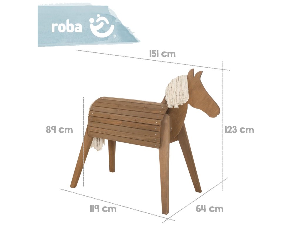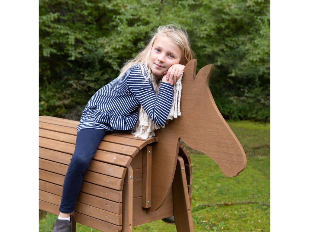 Venkovní dřevěný kůň pro děti od 5 let nabízí nekonečné možnosti zábavy a rozvoje. Tento robustní a pevný kůň je perfektní pro hru na zahradě. Děti si mohou užívat lezení, jízdu na koni, akrobatické cvičení nebo gymnastiku. Kůň podporuje kreativitu a rozvoj jezdeckých technik. Hříva a ocas koně se dají stylově upravovat nebo zaplétat, což dětem poskytuje skutečný zážitek z jízdy na koni. Výška koně v kohoutku je 89 cm. Díky výztuze v těle je zajištěna vysoká stabilita, což je ideální pro aktivní hry. Koně mohou děti používat pouze pod dohledem dospělé osoby.
