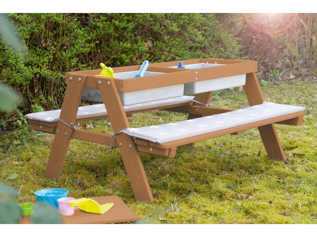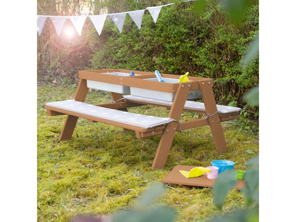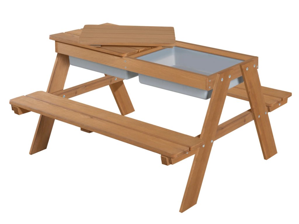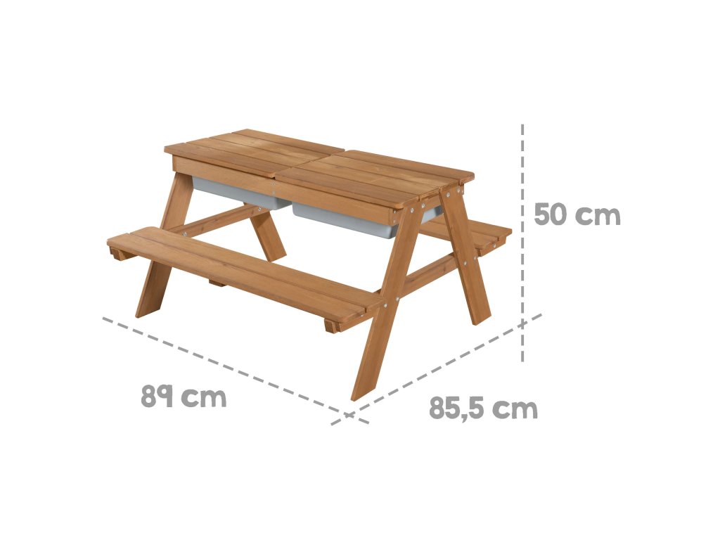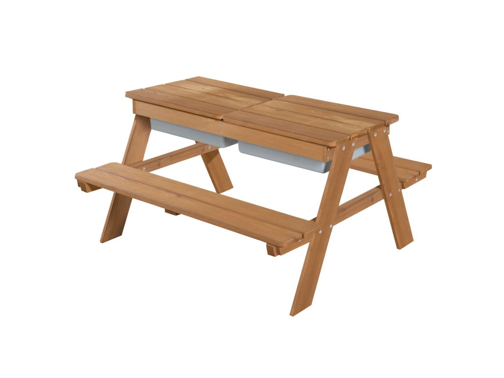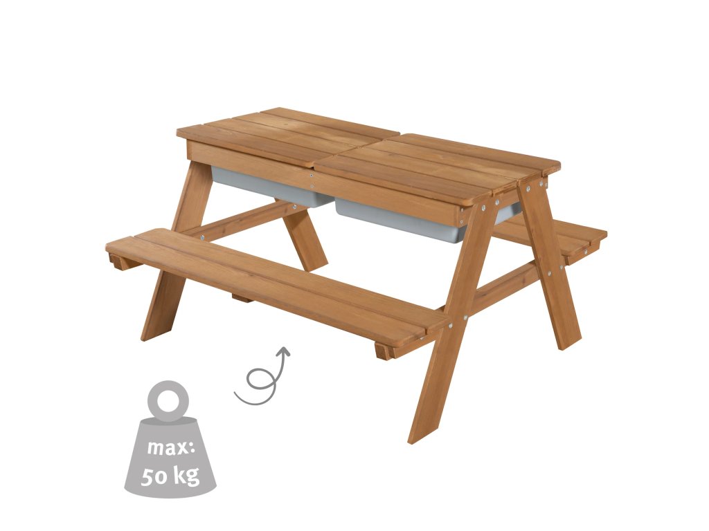 Tato dětská sedací souprava má stůl s hracími vaničkami. Je vyrobena z kvalitního, povětrnostním vlivům odolného masivního dřeva, proto je ideální na zahradu nebo na terasu. Souprava je vhodná pro děti od 1 do 8 let. Zaoblené rohy hracího stolu a robustní konstrukce zajišťují optimální bezpečnost. Lavice a stůl dětské sedací soupravy jsou pevně spojeny, což zaručí stabilitu a ochranu proti převrácení. Lavice i deska stolu mají nosnost až 50 kg. Multifunkční sedací souprava slouží nejen na pikniky, ale i jako skvělý prostor na smyslové hraní. Deska stolu je odnímatelná, což umožňuje dětem hrát si ve vaničkách s vodou a stavět hrady z písku. Poté se deska jednoduše vrátí zpět a stůl je připraven pro tvoření, malování nebo stavění. V zimě lze sedací soupravu přeměnit na stůl na tvoření v interiéru, do vaniček si můžete uložit kreativní potřeby.