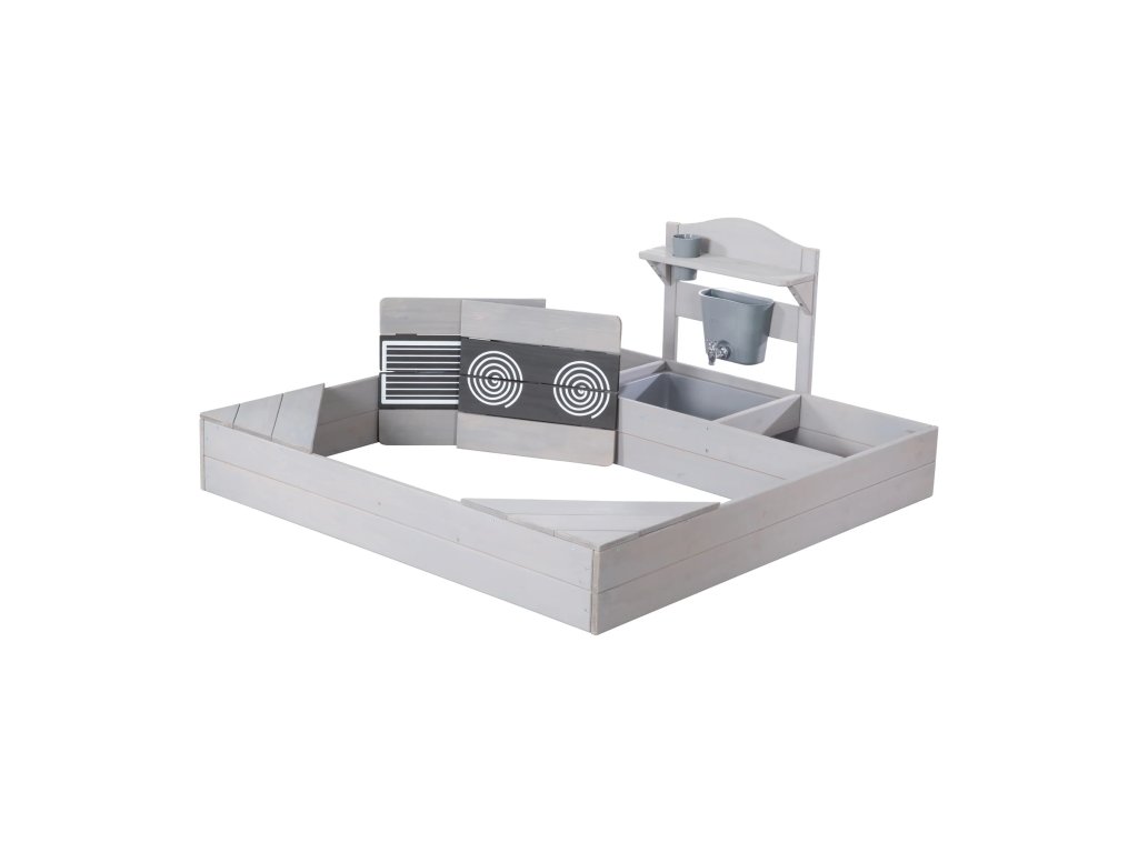 Pískoviště z masivního dřeva nabízí dětem od 12 měsíců prostor pro nekonečnou zábavu i objevování. Díky integrované kuchyňce si děti mohou hrát s pískem, vodou i doplňky a vytvářet vlastní malé kuchařské dobrodružství na zahradě, terase nebo i větším balkoně. Součástí jsou dva odnímatelné panely s realistickým motivem varné desky a grilu, které podporují dětskou fantazii a dělají hru ještě zábavnější. Pod nimi se nachází praktické úložné prostory, kam si děti mohou uklidit hračky, formičky nebo nádobí. Nechybí ani nádoba na vodu s kohoutkem a hrnek, díky kterým si děti mohou užít interaktivní hru. Pro pohodlné hraní jsou v rozích pískoviště umístěny dvě sedací plochy, které dětem poskytují místo k odpočinku i dalším aktivitám.