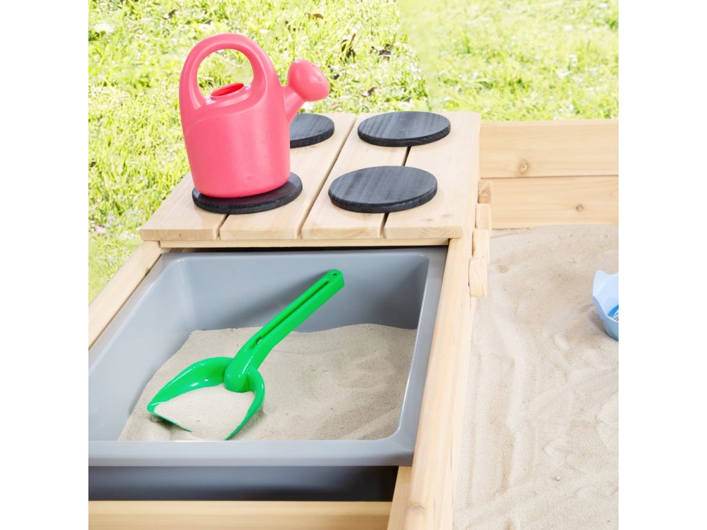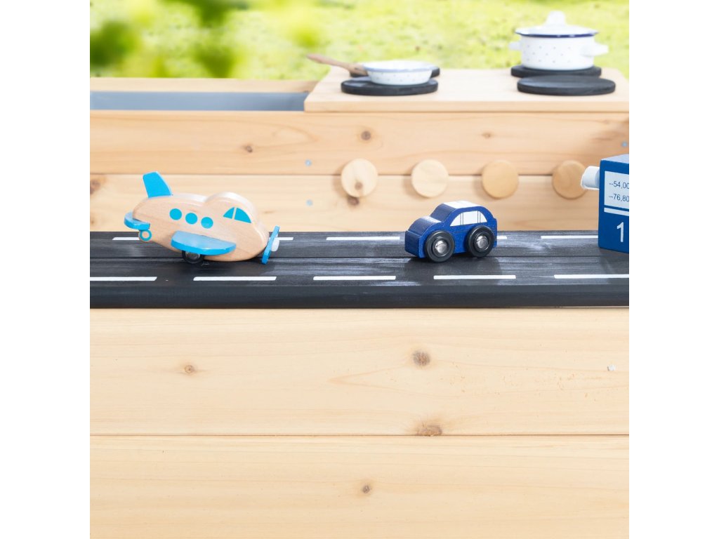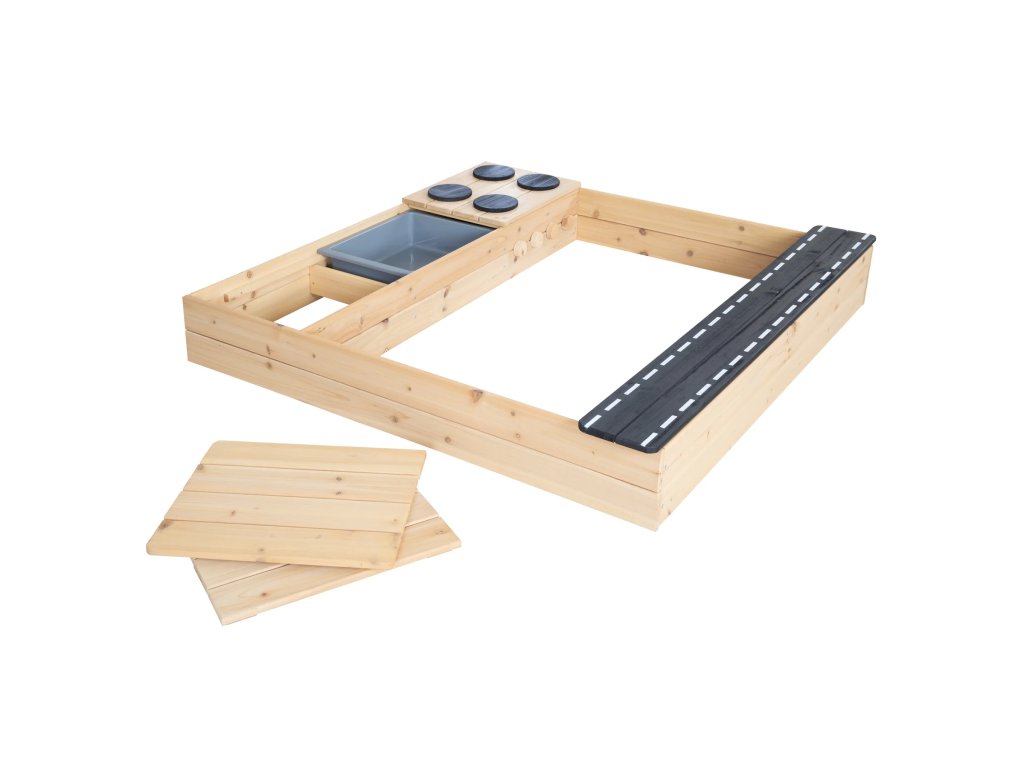 Pískoviště se silnicí pro autíčka a varnou deskou je vhodné pro děti od 12 měsíců. Odnímatelná plastová nádoba umožňuje hru s vodou nebo pískem. Děti si mohou hrát s auty, stavět cesty nebo kombinovat pískové a vodní hry, čímž rozvíjejí motoriku a kreativní myšlení. Varná deska přidává další rozměr zábavy. Děti mohou vařit s pískem, vodou či přírodními materiály a rozvíjet představivost a spolupráci s kamarády. Vyjímatelná plastová nádoba se může naplnit vodou, pískem nebo poslouží na uložení drobných hraček. Pískoviště je odolné vůči povětrnostním vlivům a snadno se čistí. Je vyrobeno z masivního dřeva s přírodní povrchovou úpravou. Dřevo pochází z udržitelných zdrojů. Hladký povrch a zaoblené hrany zajišťují hru bez rizika zranění. Rozměry pískoviště poskytují dostatek prostoru pro hru více dětí najednou.