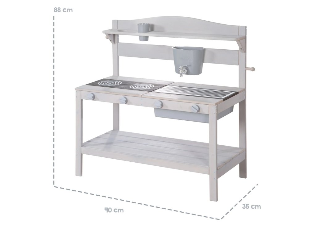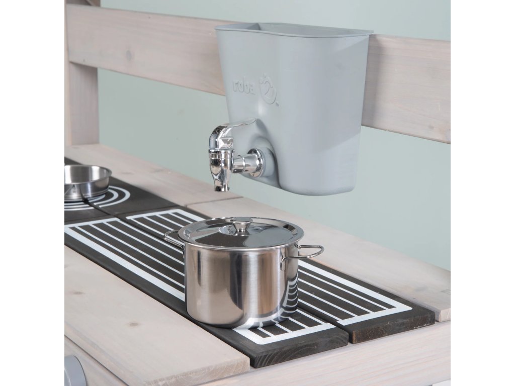 Venkovní kuchyňka Roba je ideální na zahradu, terasu i do vnitřních prostor a nabízí dětem nekonečné možnosti hraní rolí a kulinářských dobrodružství. Obsahuje dvě odnímatelné desky s grilem a varnou deskou, hrnec, poklici, obracečku, 4 otočné knoflíky, odnímatelnou mísu s nádobou na vodu a funkčním kohoutkem, 2 hrnky a 2 háčky. Velký odkládací prostor poskytuje variabilní úložný prostor pro příslušenství a ingredience, takže hra je vždy přehledná. Venkovní kuchyňka je vyrobena z masivního dřeva pocházejícího z udržitelných zdrojů a ošetřena mořidlem odolným vůči povětrnostním vlivům. Přírodní materiál zajišťuje dlouhou životnost. Díky zaobleným hranám a rohům nehrozí dětem zranění. Hraní rolí rozvíjí důležité schopnosti, jako je sdílení, spolupráce a komunikace. Ovládání kohoutku, knoflíků a dalších prvků podporuje jemnou motoriku a koordinaci. Kuchyňka tak kombinuje zábavu s učením pro děti od 18 měsíců.