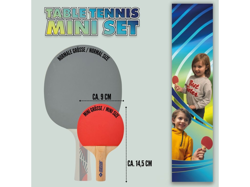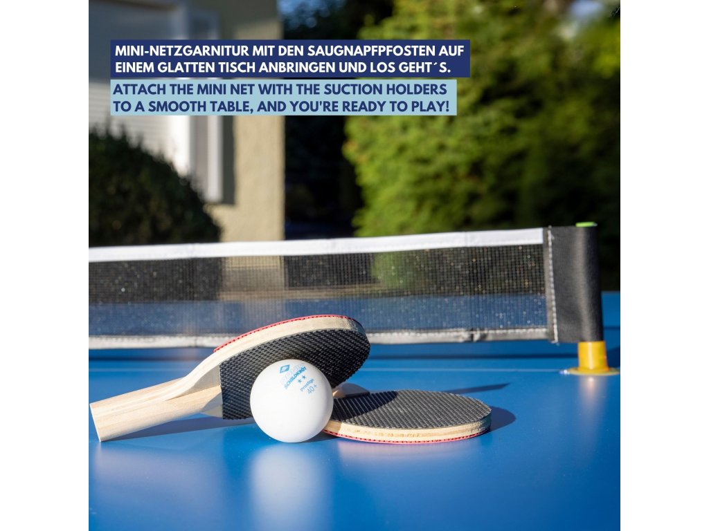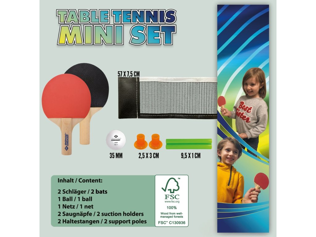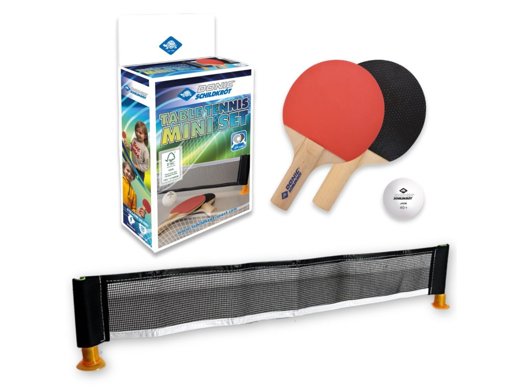 Mini sada na stolní tenis Donic-Schildkröt je skvělá zábava pro malé i velké, kterou můžete využít téměř kdekoliv. Sada obsahuje dvě malé rakety (14 x 9 cm) vyrobené ze dřeva z odpovědně obhospodařovaných zdrojů, s povlakem z pravé gumy. Součástí balení je síť o šířce 57 cm a výšce 7,5 cm, černá s bílým okrajem, kterou snadno připevníte na jakýkoli hladký povrch díky přísavkám. Stačí přísavky na chvíli navlhčit a síť bude držet i na mírně strukturovaných stolech. Sada obsahuje také plastový míček o průměru 35 mm, vyrobený z materiálu Poly 40+, který má dobrý odraz. Pokud míček ztratíte nebo rozbijete, můžete použít jakýkoli standardní míček na stolní tenis (40 mm). Tato mini sada se skvěle hodí pro rychlé a zábavné hraní během polední přestávky, mezi hodinami ve škole nebo i na večírku. Dá se rychle a snadno postavit například u kuchyňského nebo kancelářského stolu. Dodává se v ekologickém kartonovém obalu.