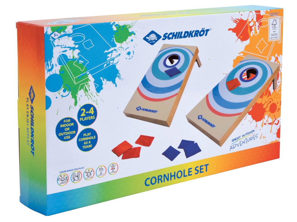 Sada Schildkröt Cornhole je zábavná volnočasová hra pro 2–4 hráče, která vyžaduje zručnost a dobrou mušku. V této americké oblíbené hře je třeba hodit 4 červené a 4 modré pytlíky s pískem do otvoru ve dvou šikmých částech cílové desky (52 x 30 x 14 cm). Sada obsahuje 2 dřevěné desky se skládacími nohami a 8 látkových pytlíků naplněných pískem (4 červené / 4 modré). Zásah do otvoru má hodnotu 3 bodů, zásah do desky má hodnotu pouze 1 bod. Ideální hra pro venkovní hraní s přáteli, kterou si můžete vzít s sebou kamkoli o víkendech nebo na dovolenou. Vyrobeno z MDF dřeva, které pochází z odpovědně obhospodařovaných lesů.Doplňkové parametry