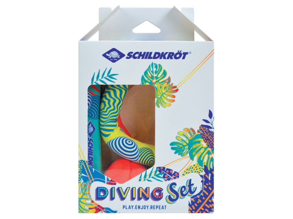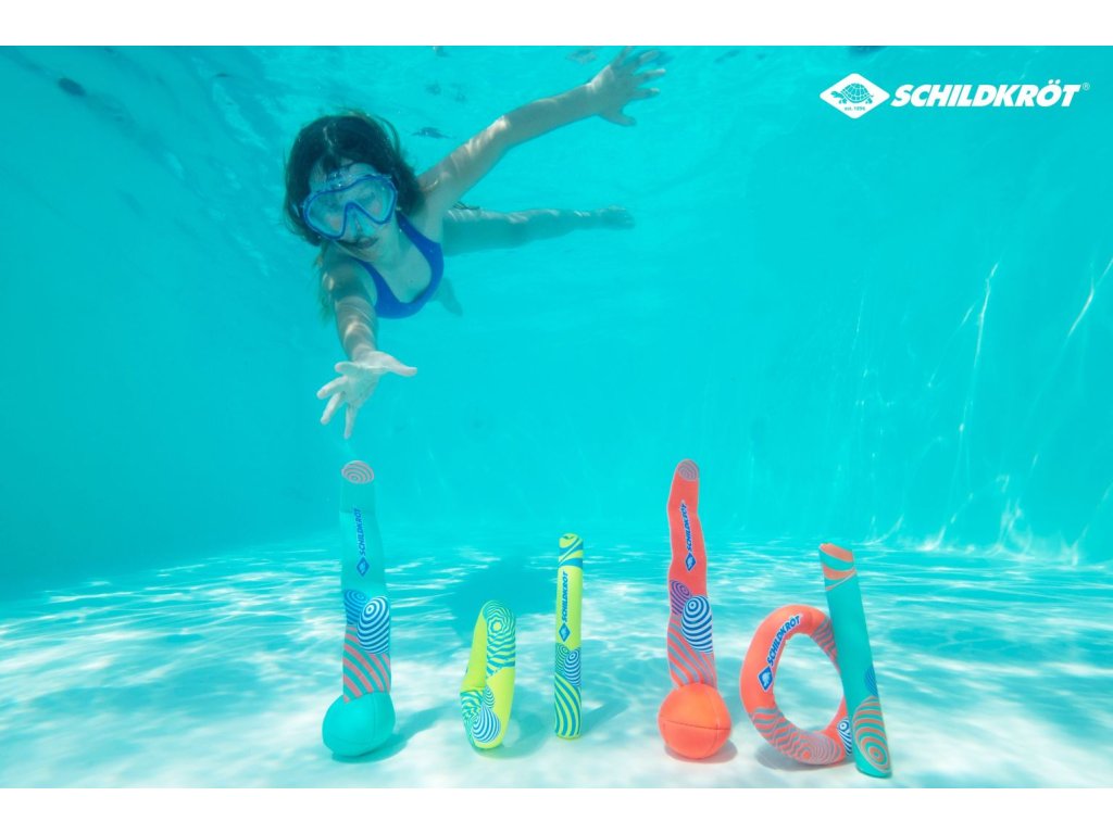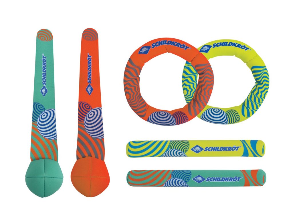 Neoprenová potápěčská sada nabízí zábavu pro malé i větší děti při potápění a házení pod vodou. Sada obsahuje 6 dílů: 2 pruty (19 cm, Ø 2,5 cm), 2 kruhy (Ø 14 cm) a 2 míčky s ocásky (Ø 6 cm, délka ocasu 20 cm). Všechny prvky jsou potaženy neoprenem a částečně naplněny pískem, díky čemuž jsou měkké, bezpečné a snadno se uchopí. Pěnové vložky umožňují, aby kruhy, pruty a míčky zůstaly v bazénu stát ve vzpřímené poloze. Jasné zářivé barvy zajišťují dobrou viditelnost ve vodě a děti rychle získají pocit úspěchu při potápění a chytání. Sada je ideální pro domácí i veřejné bazény. Sadu můžete využít jako originální dárek, který kombinuje zábavu a rozvoj motoriky.