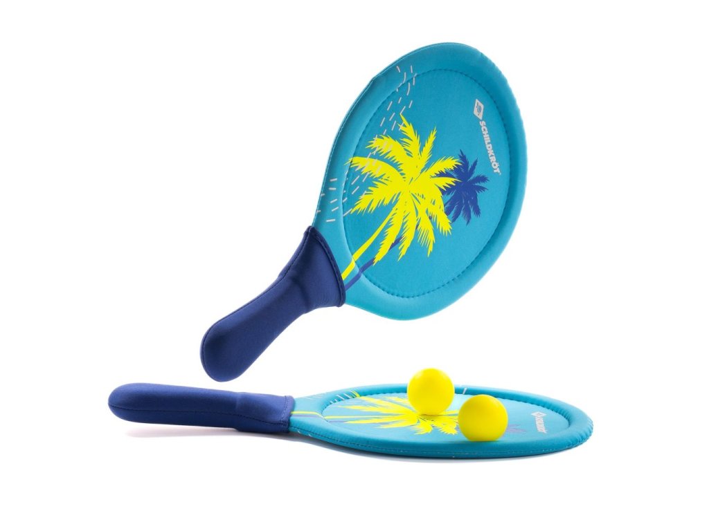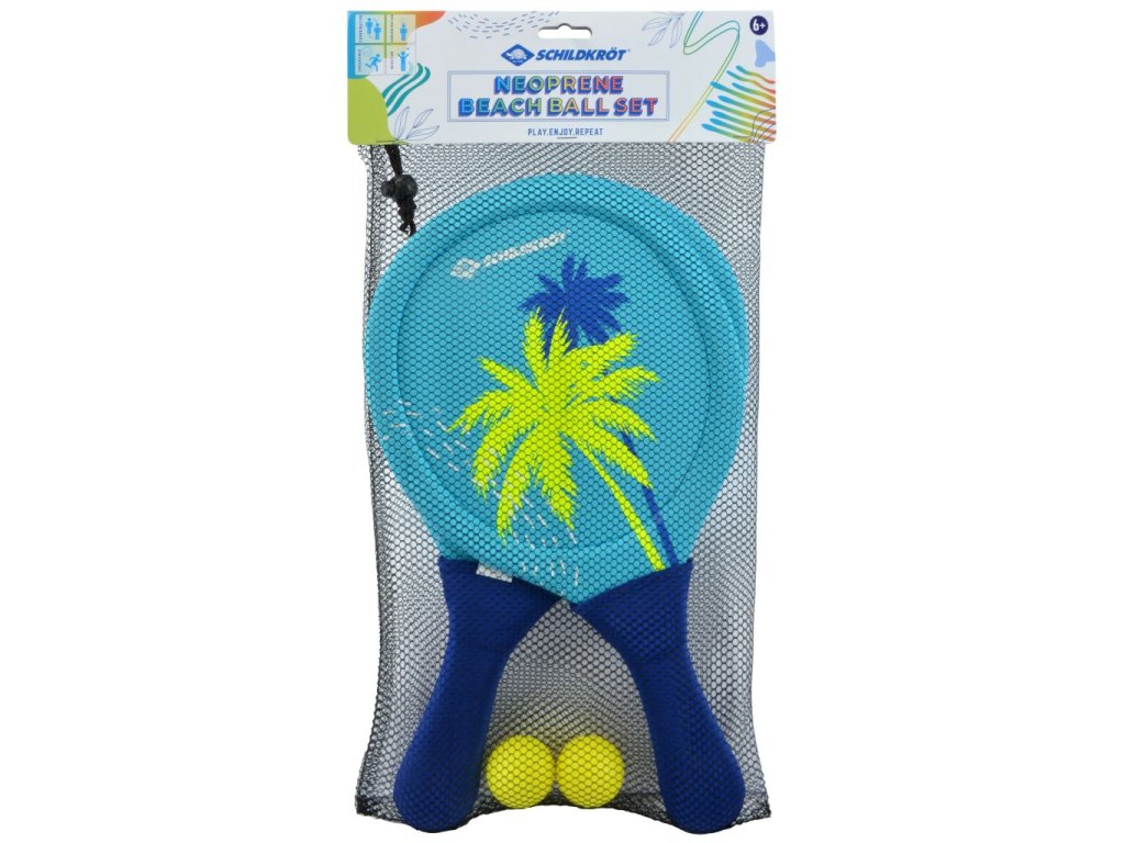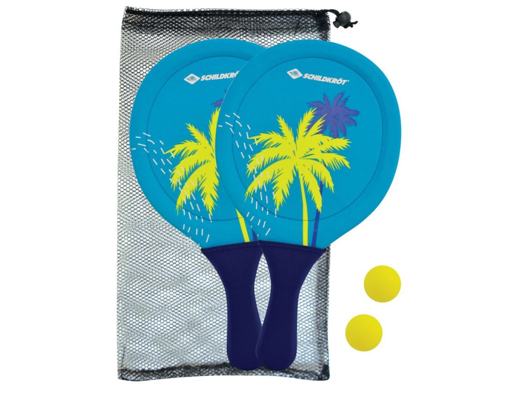 Plážová sada z neoprenu, která nabízí hodiny zábavy na pláži, v parku i na zahradě. Sada obsahuje 2 pálky (38 × 22,5 × 0,8 cm) potažené elastickým neoprenem, 2 gumové míčky (Ø 40 mm) a uzavíratelný síťovaný sáček se stahovací šňůrkou. Elastický neopren zajišťuje silný odraz pro delší lety míčků a zároveň tlumí hluk, takže hra je tišší než u klasických dřevěných sad. Pálky jsou měkké a přilnavé, pohodlně se drží a snadno ovládají. Neopren a plastové jádro jsou odolné vůči slané vodě, takže sada vydrží i mokro. Ideální volba pro rodinnou zábavu, hraní ve dvou nebo malé turnaje na pláži či na zahradě.