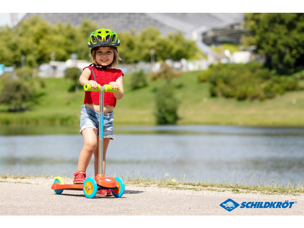 Koloběžka Schildkröt Kids Scooter Little je ideálním modelem pro děti od 3 let, které se chtějí naučit jezdit na koloběžce. Tři kola koloběžky zajišťují, že pro děti je mnohem snazší udržet rovnováhu. Odnímatelná řídítka a nízká hmotnost umožní koloběžku snadno přepravovat kamkoli. Velmi robustní plastová plošina je vybavena protiskluzovou strukturou a nabízí plochu pro nohy o rozměrech 26 x 12 cm. Děti tak mají dostatek prostoru pro získání pocitu bezpečí a protiskluzová plošina zajišťuje dobré postavení. Zároveň je díky ní koloběžka velmi lehká (1,8 kg) a snadno ovladatelná.