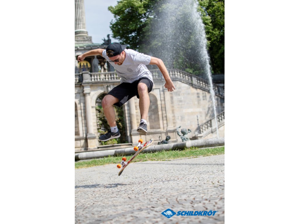 Skateboardu 31'' Kicker od značky Schildkröt je ideálním modelem pro začátečníky. 31palcová deska (79 x 20 cm) vyrobena z 9vrstvého javorového dřeva má protiskluzovou pásku, která zajišťuje bezpečný a stabilní postoj. Deska má navíc dvojitý kickboard a je mírné zakřivená dovnitř. Skateboard je kompletně smontován s kolečky (tvrdost 85a, velikost: 54 x 36 mm).