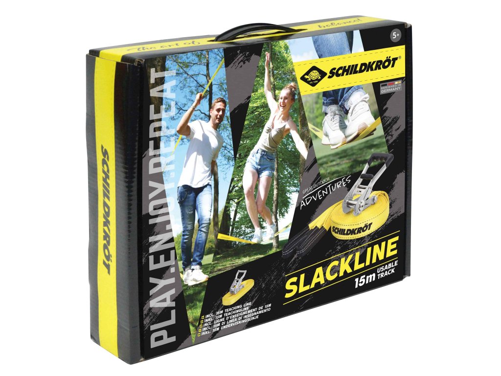 Slackline s tréninkovou šňůrou od značky Schildkröt je ideální pro děti, teenagery i dospělé. Slackline je dlouhá 15 metrů, široká 5 cm. Součástí balení je robustní kovová ráčna s plastovou rukojetí a chráničem ráčny. Pro začátečníky obsahuje balení tréninkové lano (15 m x 2,5 cm), s malou kovovou ráčnou – slouží jako madlo pro bezpečné osvojení prvních pohybů na slackline. Vše se dá uložit do praktické nylonové tašky, která je součástí balení. Slackline sada se snadno a rychle sestavuje a je dodávána s přehledným návodem k montáži. Slackline Schildkröt je ideální pro děti, teenagery i dospělé. Přiložená cvičná lana zajišťuje rychlou zábavu i pro začátečníky. Maximální nosnost 150 kg
