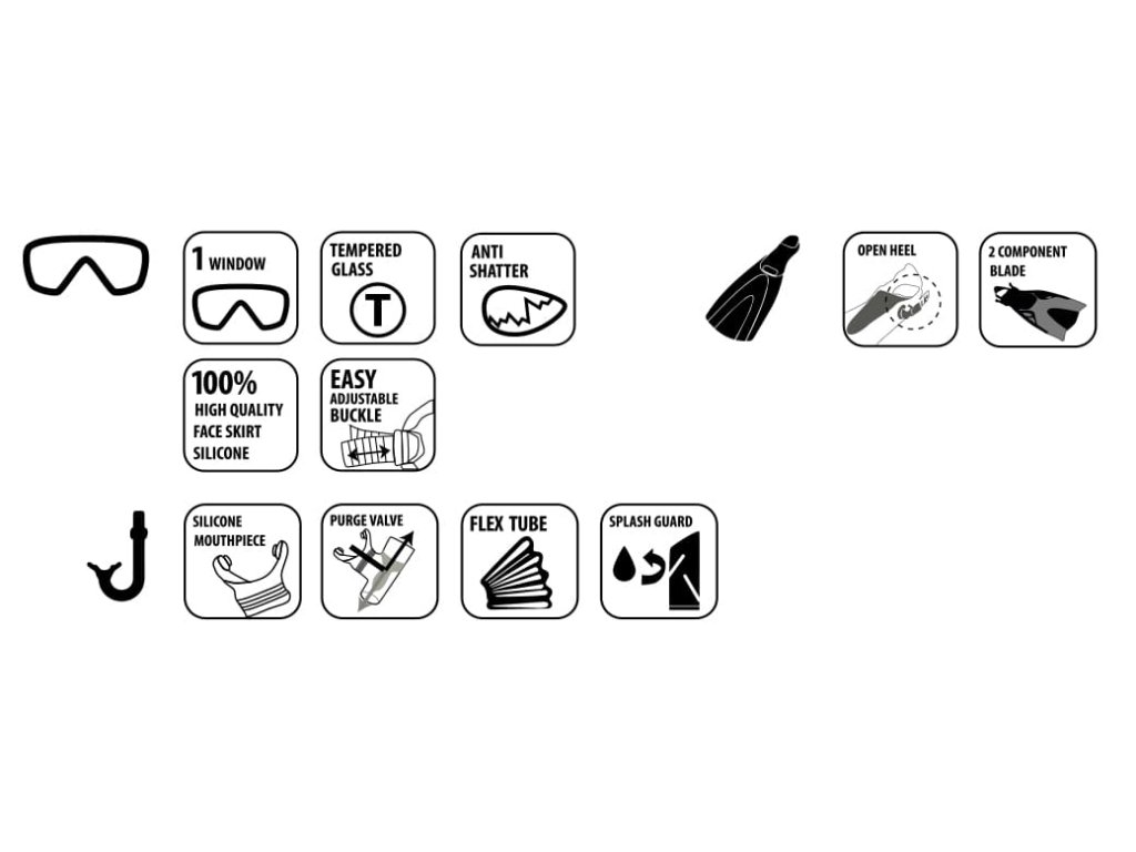 Potápěčská souprava Cayman pro dospělé zahrnuje silikonové potápěčské brýle, šnorchl a nastavitelné ploutve (L/XL 43–47). Baleno v praktickém síťovaném sáčku se stahovací šňůrkou. Souprava zaujme svým vynikajícím vybavením, vysoce kvalitním silikonovým materiálem a moderním designem. Maska je vyrobena z jednoduchého a souvislého tvrzeného bezpečnostního skla, tělo masky je z vysoce kvalitního silikonu. Silikonové popruhy s přezkami jsou snadno nastavitelné pro různé velikosti hlavy. Šnorchl je vyroben z kvalitního silikonu, obsahuje odsávací ventil a flexibilní trubici. Ochrana proti stříkající vodě v poutavé neonově oranžové barvě. Nastavitelný držák trubice Easy Clip a polosuchý vrchní díl pro lepší komfort při používání. Ploutve jsou otevřené vzadu s nastavitelným popruhem, který se přizpůsobí různým velikostem nohou. Anatomicky tvarovaná část chodidla a dvoukomponentní ploutve vyrobené z vysoce kvalitního strečového materiálu pro lepší flexibilitu.