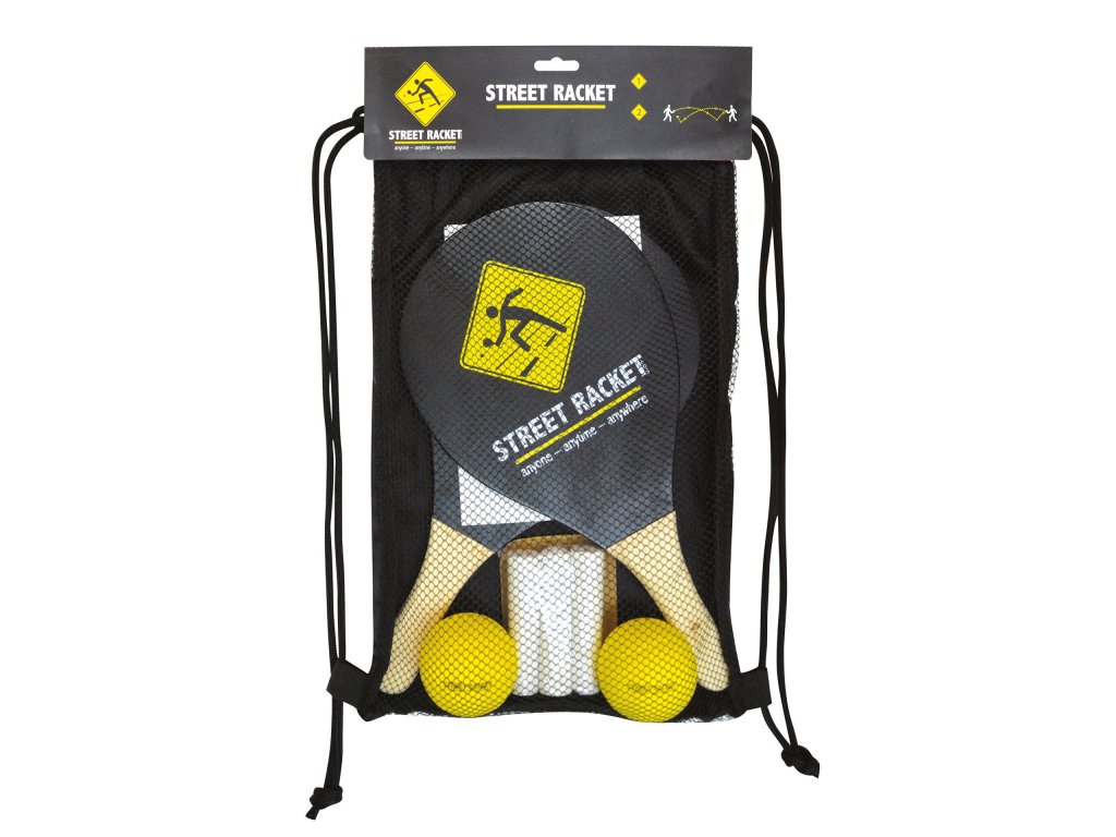 Street Racket je nový raketový sport vyvinutý ve Švýcarsku, který lze hrát kdykoli a kdekoli, bez nutnosti složité infrastruktury. Stačí si vyznačit křídou kurt, například na hřišti nebo na parkovišti, a jste připraveni! Na pláži, na chodbě, v kanceláři, Street Racket lze hrát kdekoli! Tuto novou pohybovou hru lze cvičit samostatně, ve dvojicích nebo ve skupinách a užít si spoustu zábavy. Rychlé úspěchy poskytují spoustu motivace a rychlý pokrok. Sada Street Racket obsahuje: 2 černě natřené dřevěné rakety (38 x 20 x 1,8 cm) s logem a rukojetí z přírodního dřeva, 2 měkké míčky z porézní pěny s velmi dobrým odrazem (70 mm), 3 křídy na vyznačení hrací plochy, návod. Vše je uloženo v černé sportovní tašce s potištěným logem a stahovací šňůrkou.
