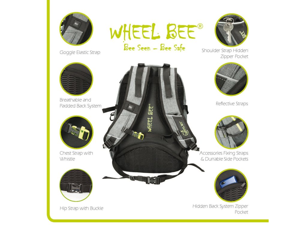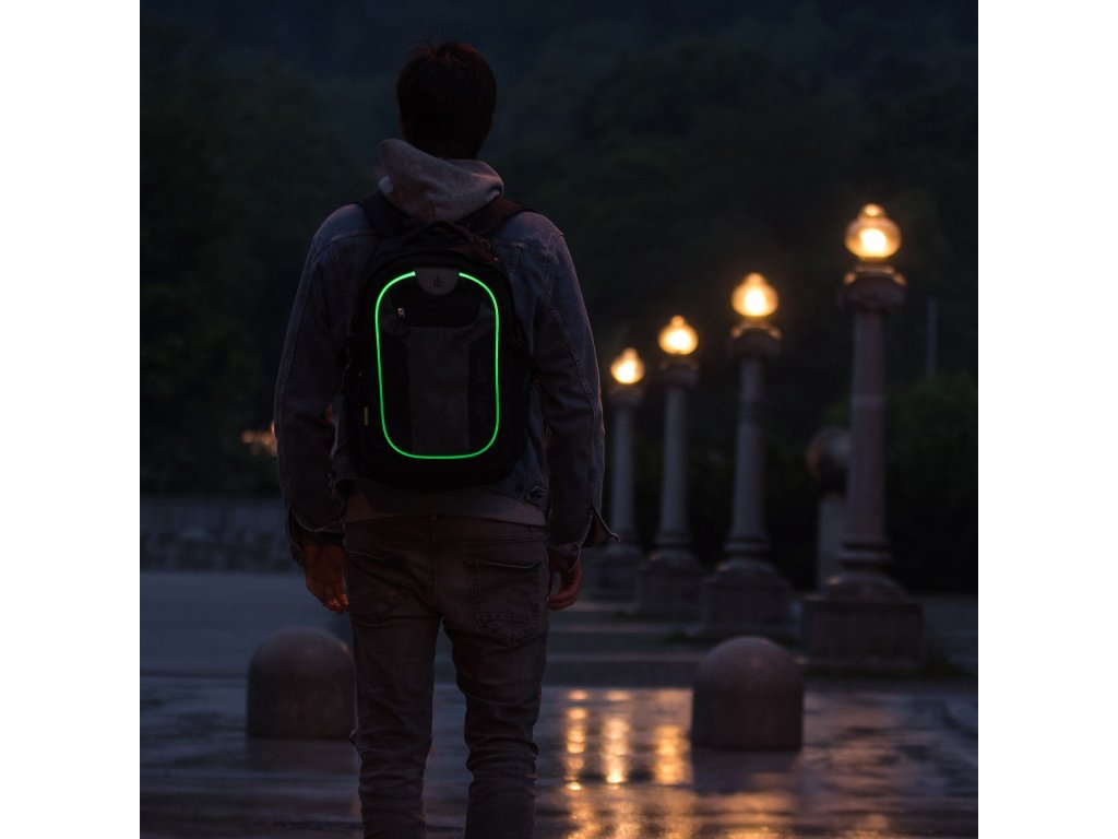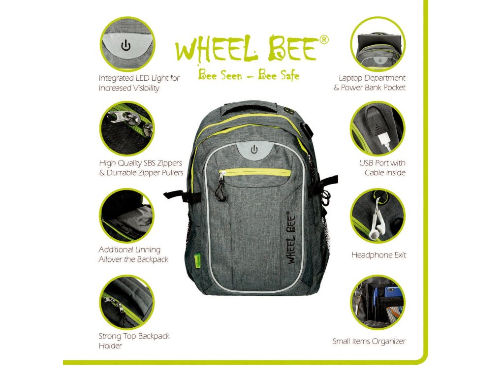 Moderní batoh do školy, na vysokou školu, do kanceláře nebo na notebook s polstrovanými zády, nastavitelnými polstrovanými ramenními popruhy a zesíleným dnem. Je vybaven LED světlem (zelené světlo je viditelné obzvláště daleko) a dalšími reflexními proužky a nabízí maximální viditelnost a bezpečnost za soumraku a ve tmě. Dvojitý pogumovaný povlak pro větší odolnost a ochranu před vlhkostí. Zadní systém cirkulace vzduchu. Batoh je vybaven USB portem pro nabíjení mobilního telefonu (připojovací kabel je součástí balení), výstupem pro sluchátka, 2 hlavními přihrádkami, 1 menší přihrádkou, 2 skrytými přihrádkami proti krádeži, přihrádkou na notebook (40 x 28 x 3,5 cm), 2 přihrádkami na powerbanky, organizérem na drobnosti, rukojetí, výškově nastavitelným hrudním popruhem s píšťalkou pro případ nouze, bederním pásem, vnějšími síťovanými kapsami, bočními popruhy na svetry a držákem na brýle. Vysoce kvalitní zip SBS. Batoh Revolution nabízí bezkonkurenční vybavení a nadčasový a moderní design v kombinaci s LED světlem pro větší bezpečnost, zejména v zimním období! Vyměnitelné baterie (2 ks CR2032) jsou součástí balení. Před prvním použitím odstraňte pojistku kontaktů baterie (průhledná fólie na vypínači). Předpokládaná životnost baterií: cca 100 hodin. Proč Wheel Bee používá zelené LED světlo místo jiných barev? Lidské oko vnímá barvy s vlnovými délkami od přibližně 400 nanometrů (fialová) do 700 nanometrů (červená). Tento rozsah od 400 do 700 nanometrů se nazývá viditelné světlo nebo viditelné spektrum. Lidské oko je nejcitlivější na střední rozsah tohoto spektra – kolem 555 nanometrů. Zelené světlo má tuto vlnovou délku, což z něj činí nejviditelnější barvu pro člověka.