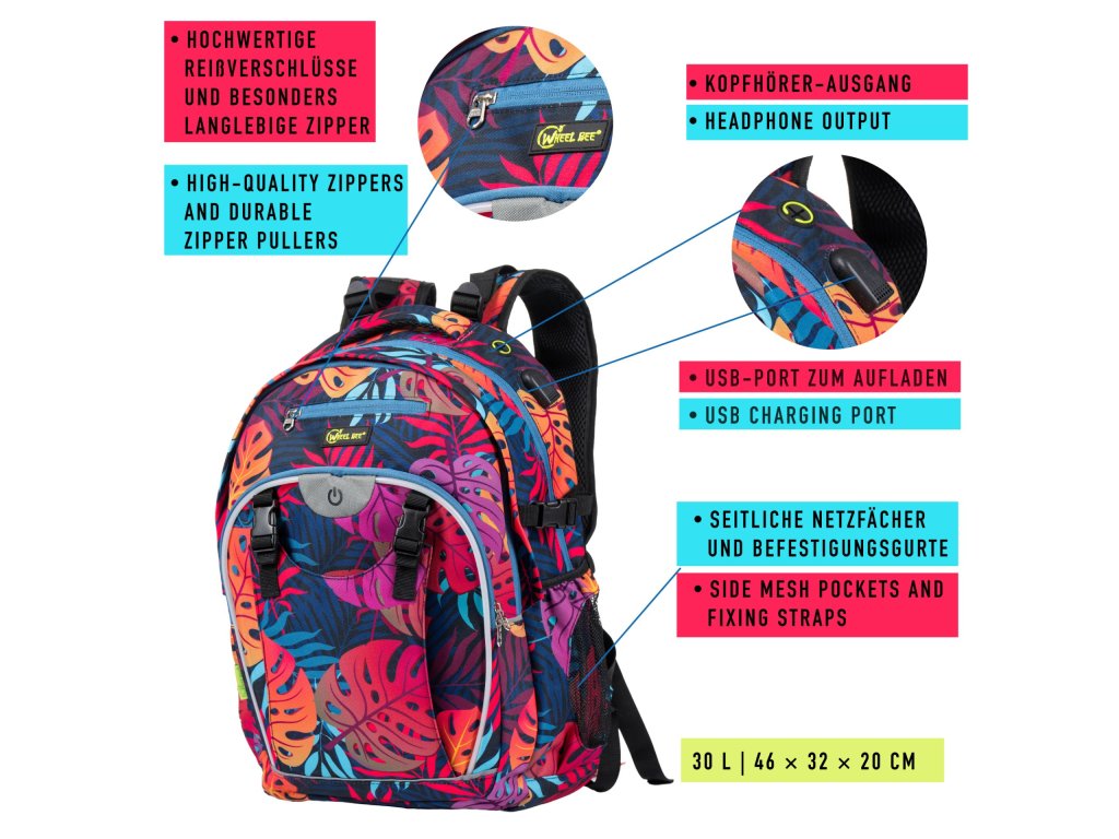 Batoh je vybaven USB portem pro nabíjení mobilního telefonu (připojovací kabel je součástí balení), výstupem pro sluchátka, 2 hlavními přihrádkami, 1 menší přihrádkou, 2 skrytými přihrádkami proti krádeži, přihrádkou na notebook (40 x 28 x 3,5 cm), 2 přihrádkami na powerbanky, organizérem na drobnosti, rukojetí, výškově nastavitelným hrudním popruhem s píšťalkou pro případ nouze, bederním pásem, vnějšími síťovanými kapsami, bočními popruhy na svetry a držákem na brýle. Vysoce kvalitní zip SBS. Vyměnitelné baterie (2 ks CR2032) jsou součástí balení. Před prvním použitím odstraňte pojistku kontaktů baterie (průhledná fólie na vypínači).