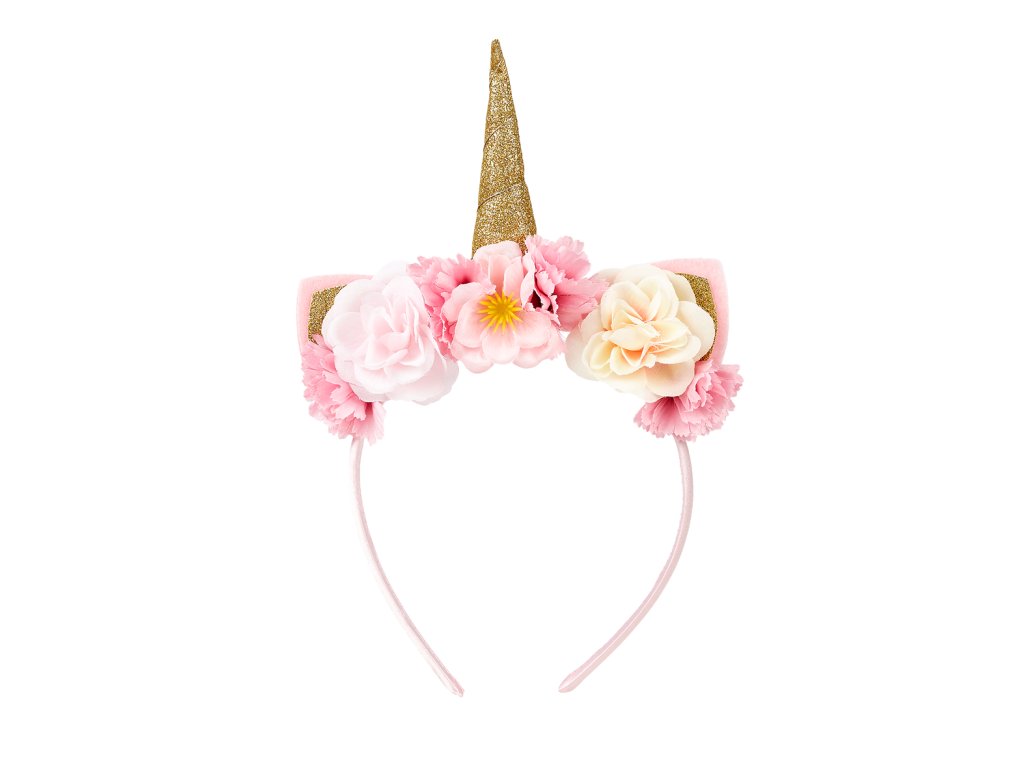 Kouzelná čelenka s květinami a rohem jednorožce je potažena saténem a zdobena velkými látkovými květinami, ušima a třpytivým zlatým rohem jednorožce. Celý design v jemných odstínech růžové a krémové je ideální pro malé princezny od 3 let. Čelenka je lehká, pohodlná na nošení a díky šířce 1 cm netlačí. Skvělá na tématickou párty i na každodenní hraní.