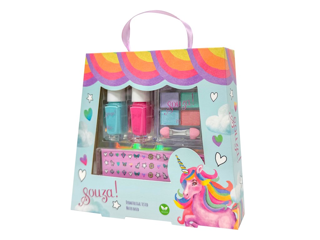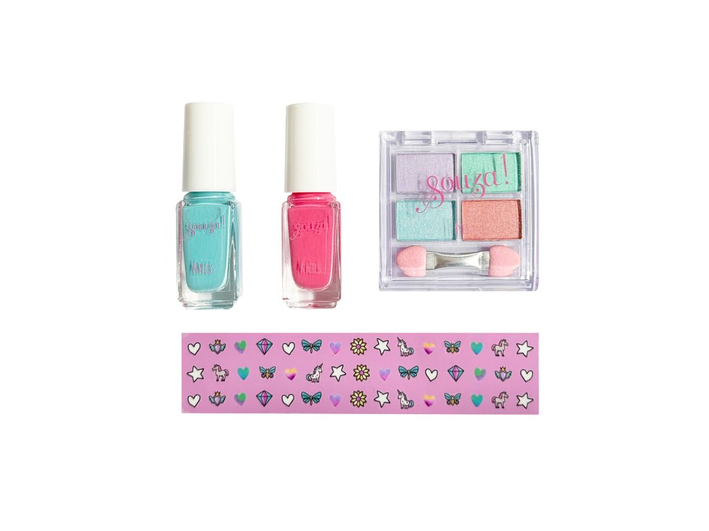 Sada obsahuje: dva slupovací laky na nehty, paletu očních stínů, arch malých samolepek na nehty, aplikátor s dvojitou houbičkou. Kosmetika je 100% veganská a netestovaná na zvířatech. Rozměry balení: 17 × 14 × 3 cm.