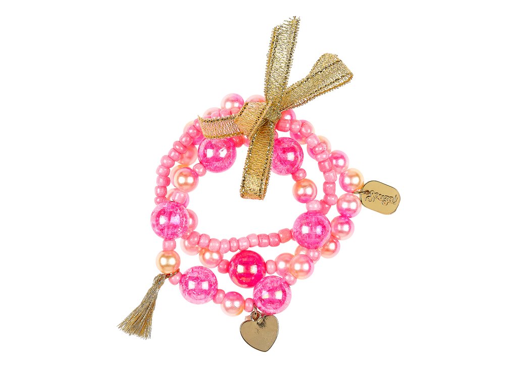 Růžové korálky jsou navlečené na pružné gumičce, která se snadno přizpůsobí dětskému zápěstí a umožňuje pohodlné nasazení bez zapínání. Každý z náramků je doplněný malým zlatým přívěskem.