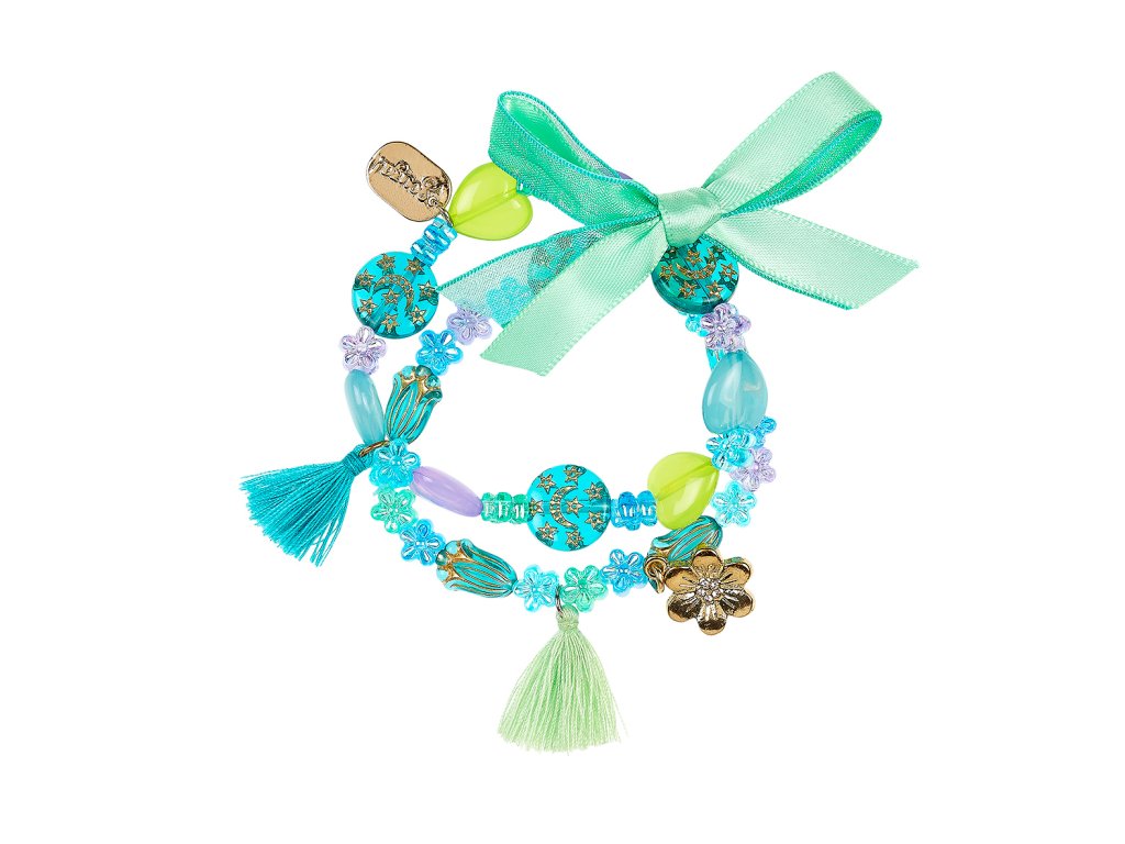 V sadě se nachází dva různě zdobené náramky, každý je doplněný malým kovovým přívěskem a střapcem. Korálky jsou navlečené na pružné gumičce, která se snadno přizpůsobí dětskému zápěstí a umožňuje pohodlné nasazení bez zapínání.