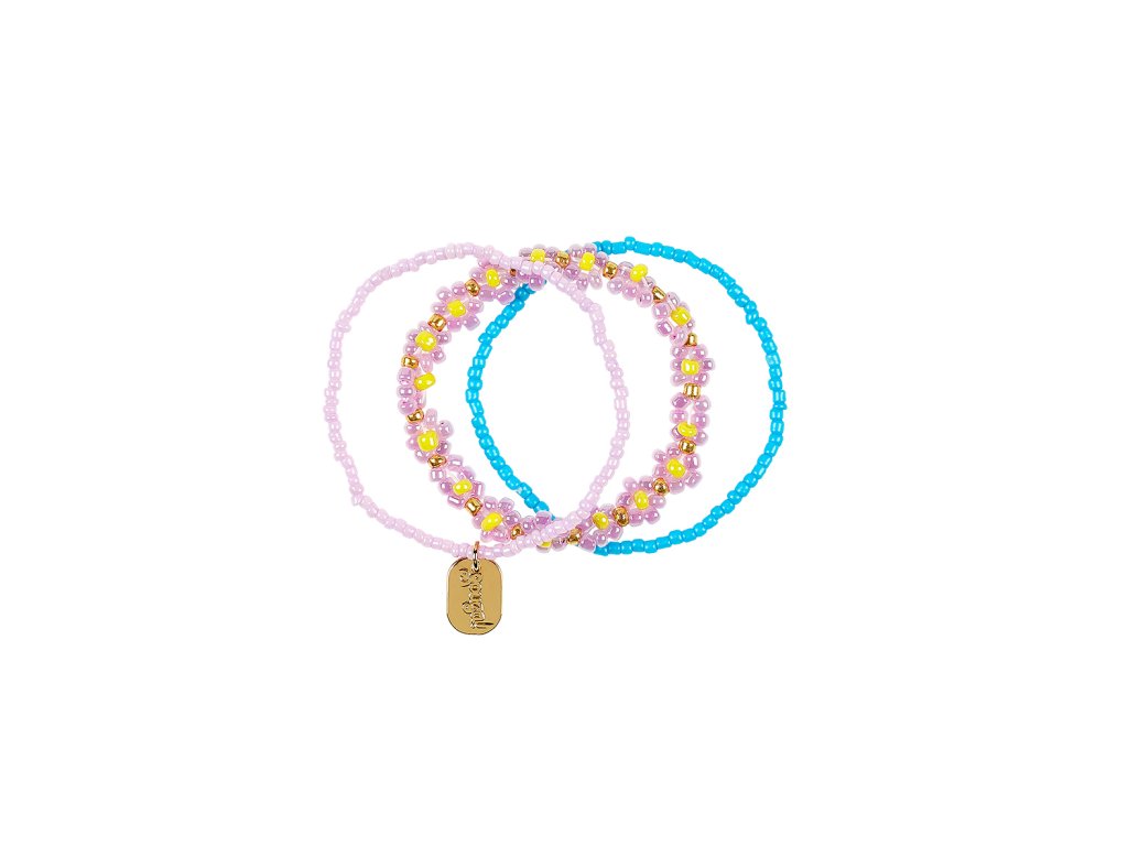 V sadě se nachází tři různě zdobené náramky – modrý a růžový a třetí s květinovým motivem. Náramky jsou navlečené na pružné gumičce, která se snadno přizpůsobí dětskému zápěstí a umožňuje pohodlné nasazení bez zapínání. Použité materiály jsou lehké, bezpečné a neobsahují škodlivé látky.