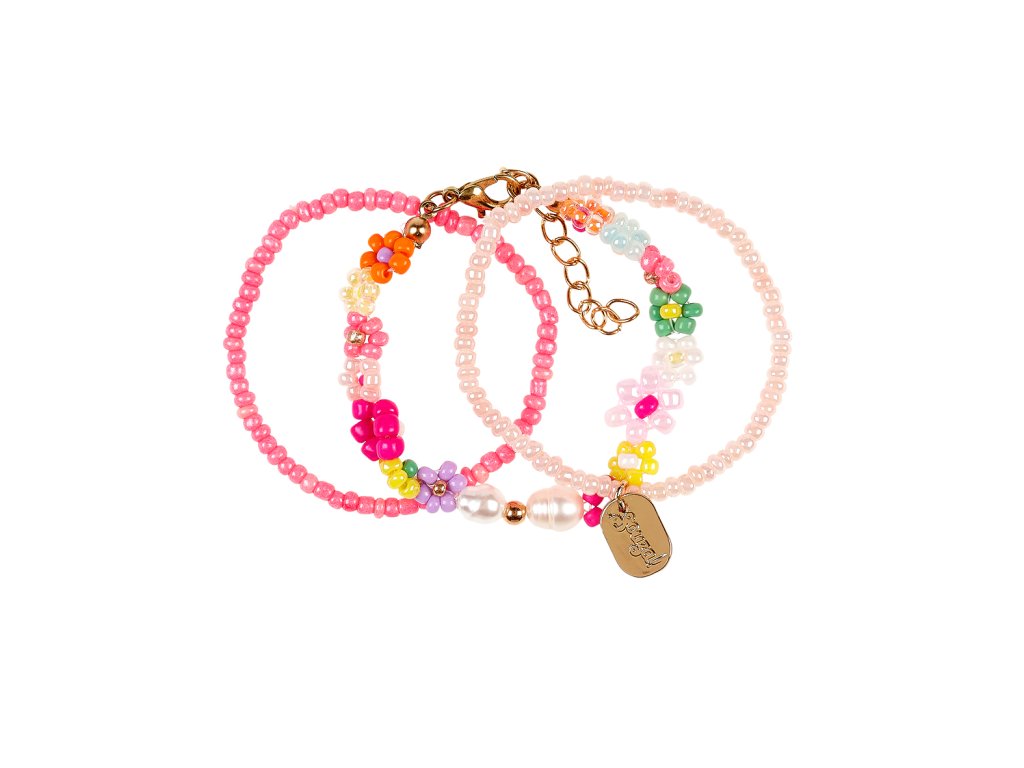 V sadě se nachází tři různě zdobené náramky – dva jednobarevné, světle růžový a tmavě růžový a třetí s barevnými korálky a květinovým motivem. Dva náramky jsou navlečené na pružné gumičce, která se snadno přizpůsobí dětskému zápěstí a umožňuje pohodlné nasazení bez zapínání. Třetí náramek s květinovým motivem má kovové nastavitelné zapínání. Použité materiály jsou lehké, bezpečné a neobsahují škodlivé látky.