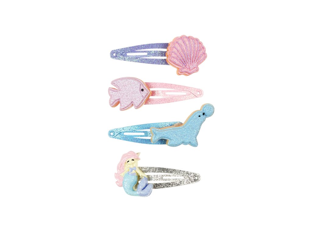 Sada čtyř třpytivých sponek do vlasů s motivy mořské panny, tuleně, rybky a mušle. Každá sponka se krásně třpytí a dodá účesu pohádkový nádech. Díky zacvakávacímu mechanismu sponky spolehlivě drží ve vlasech po celý den. Ideální doplněk pro malé parádnice od 3 let. Délka sponky je 4 cm.