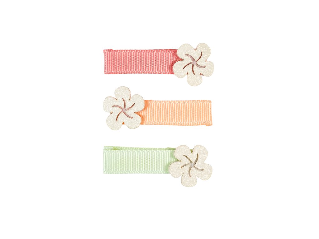 Sada tří roztomilých sponek s květinami pro malé parádnice od 3 let. Kovová část sponek je potažena rypsovou stuhou. Díky jemně vroubkovanému úchytu drží sponky spolehlivě ve vlasech. Hodí se jak na slavnostní příležitosti, tak pro běžné nošení. Ideální nápad i na malý dárek. Délka skřipce je 4 cm.