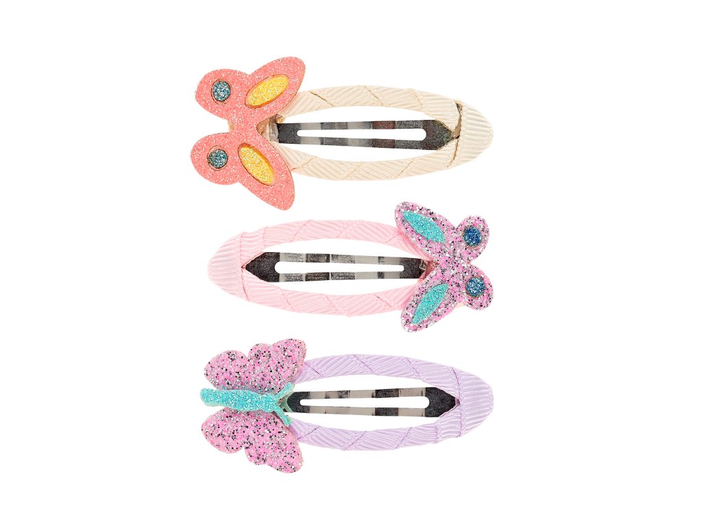 Sada tří sponek do vlasů zdobených třpytivými motýlky. Kovová část je potažena textilní stuhou, díky čemuž jsou sponky nejen šetrné k jemným dětským vláskům, ale i krásně výrazné. Díky zacvakávacímu mechanismu spolehlivě drží ve vlasech po celý den. Ideální doplněk pro malé parádnice od 3 let. Délka sponky je 5 cm.